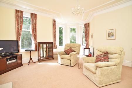 A grand reception room with impressive bay window offering pleasant views towards the Majestic Hotel. Feature fireplace with living flame gas fire.