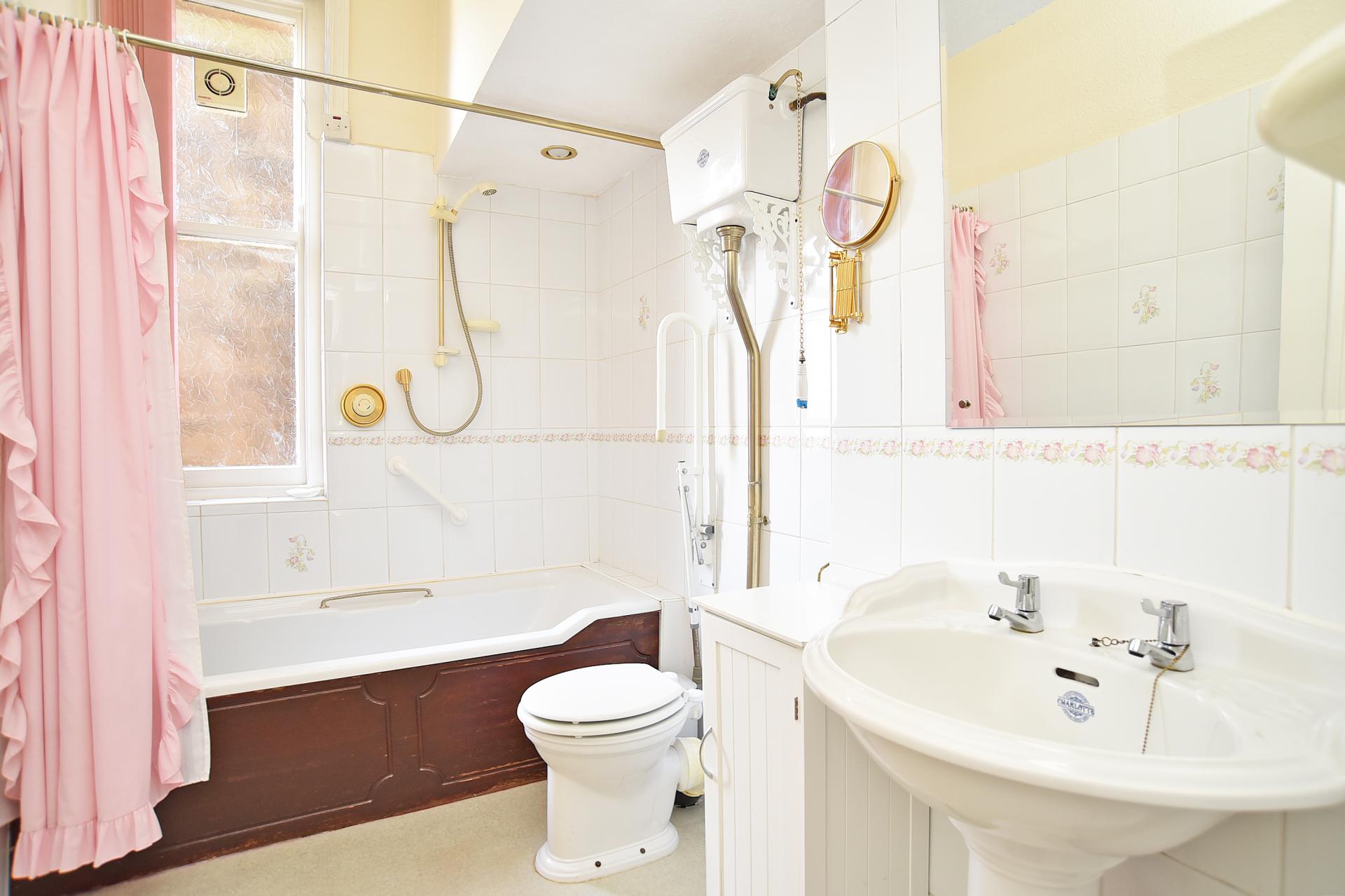 Fitted with a white suite comprising WC, basin, and bath with shower above.