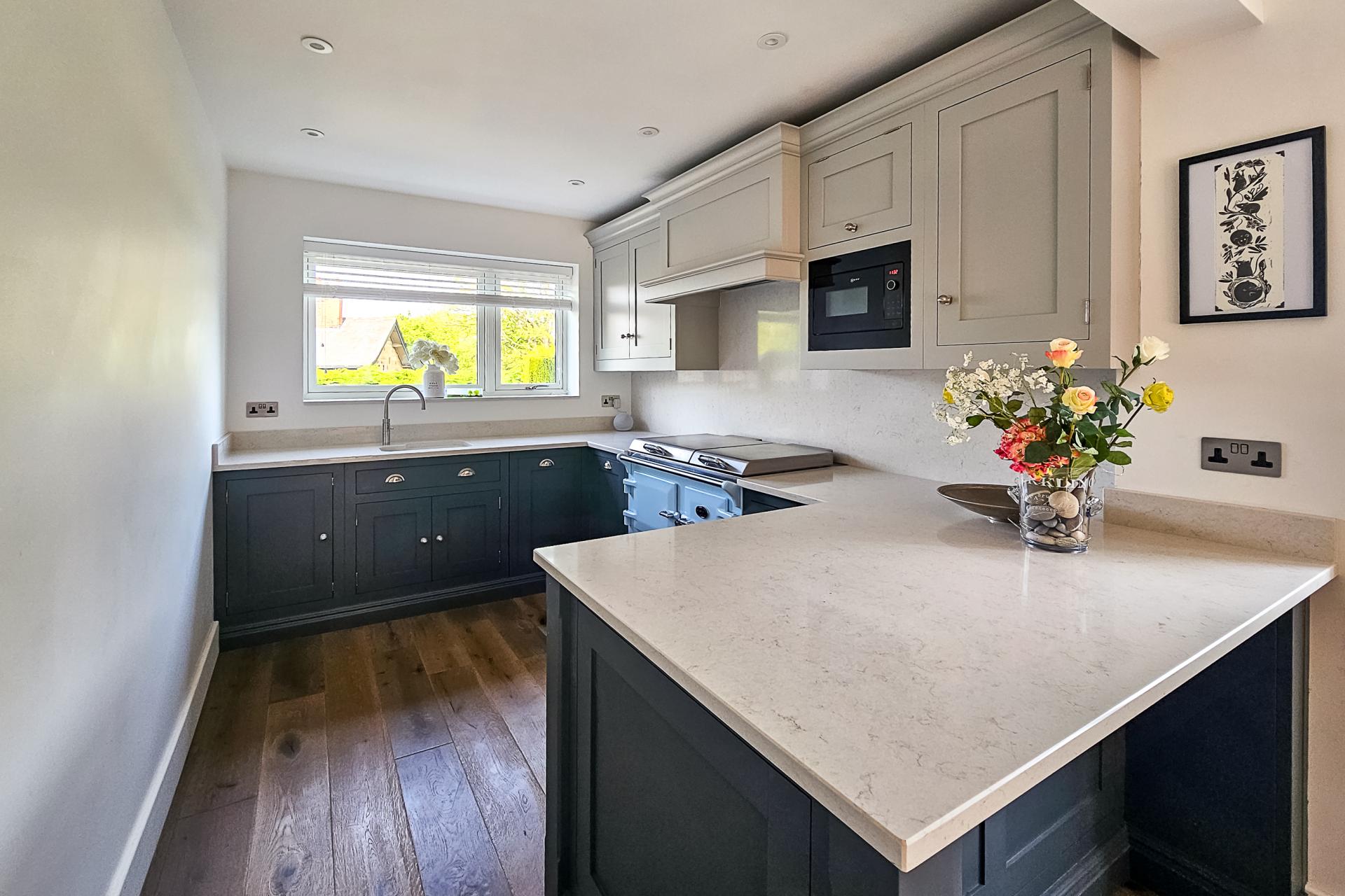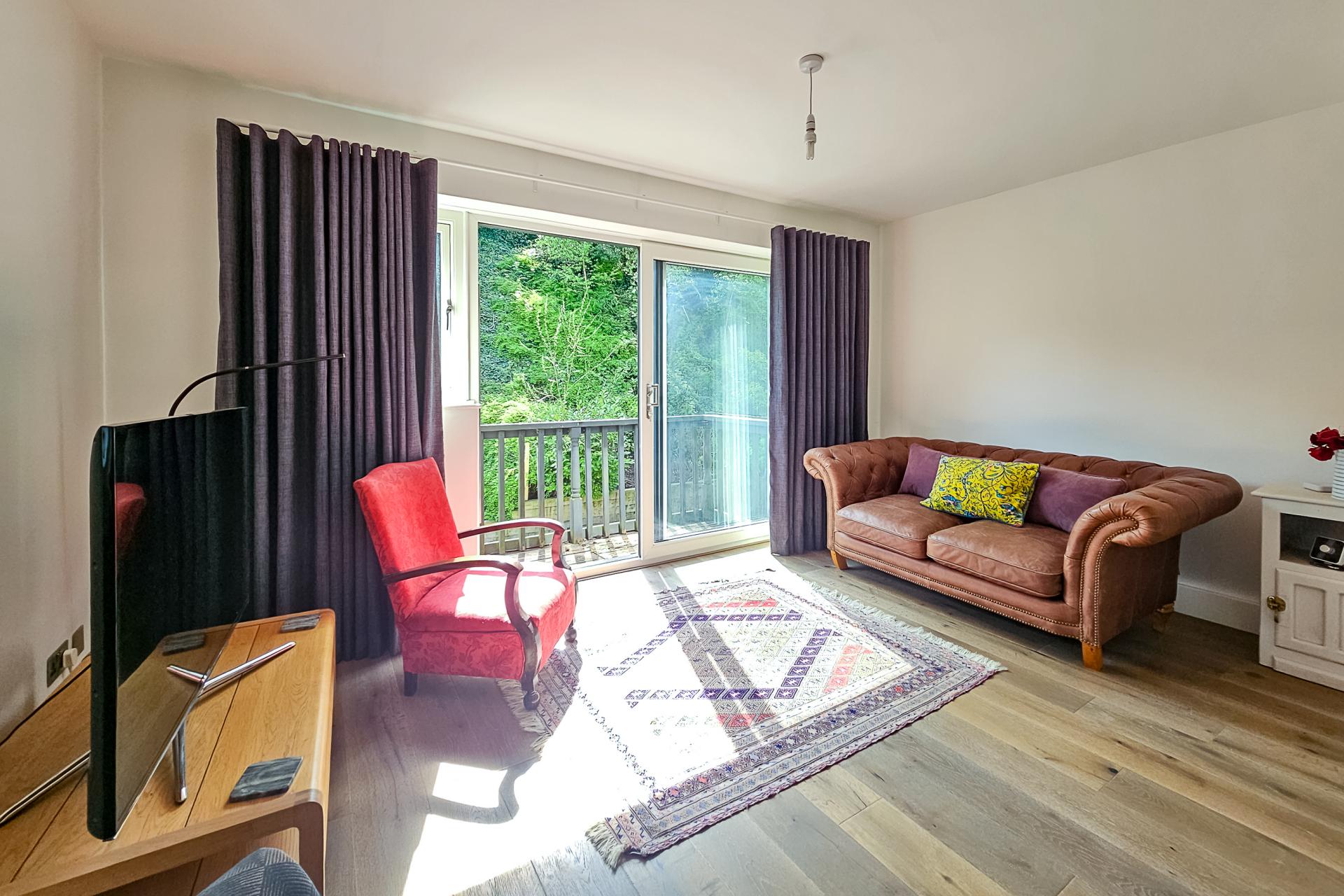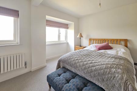 A stunning open-plan kitchen and living space with sitting and dining areas, windows on three sides and glazed sliding doors leading to a balcony. The kitchen comprises a range of stylish fitted units with quartz worktops and breakfast bar. Integrated microwave, dishwasher and fridge. There is an Everhot which is available by separate negotiation.