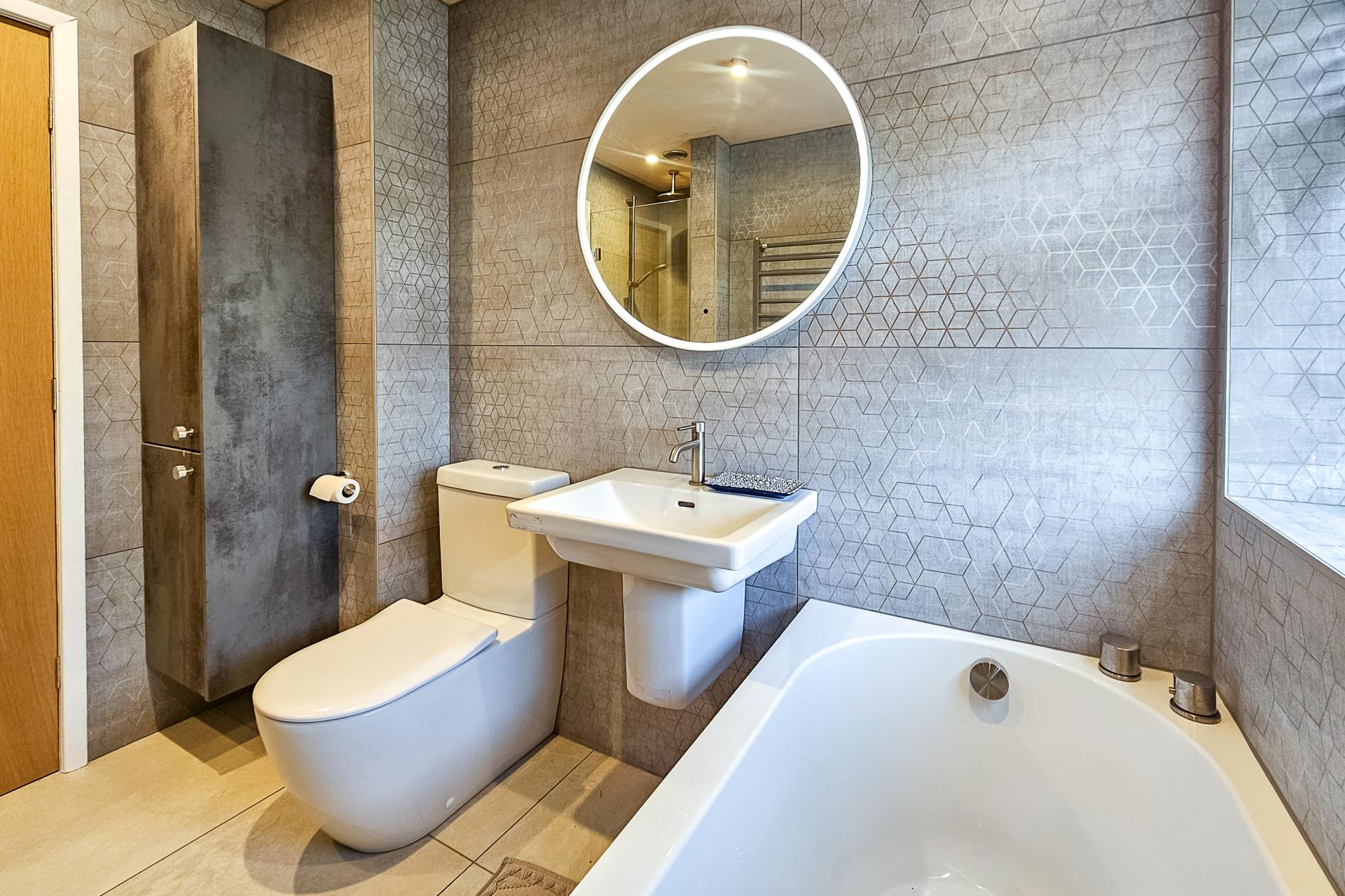 A stylish modern white suite comprising WC, washbasin, bath and walk-in shower. Tiled walls and floor. Heated towel rail.