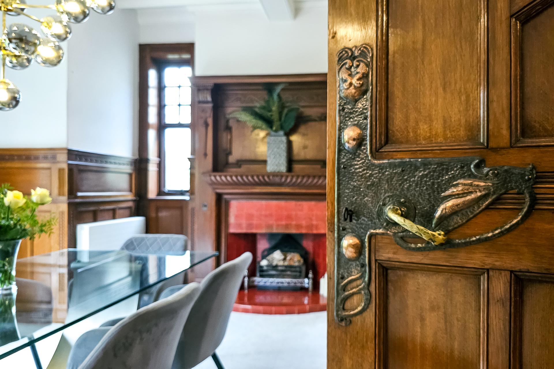 A further large reception room with wood panelled walls and ornate ceiling detail and fireplace.