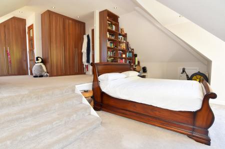 A stunning master bedroom with window to rear and glazed doors leading to a private balcony. Extensive range of fitted wardrobes, shelving and wardrobes. Access to eaves storage and window to side.