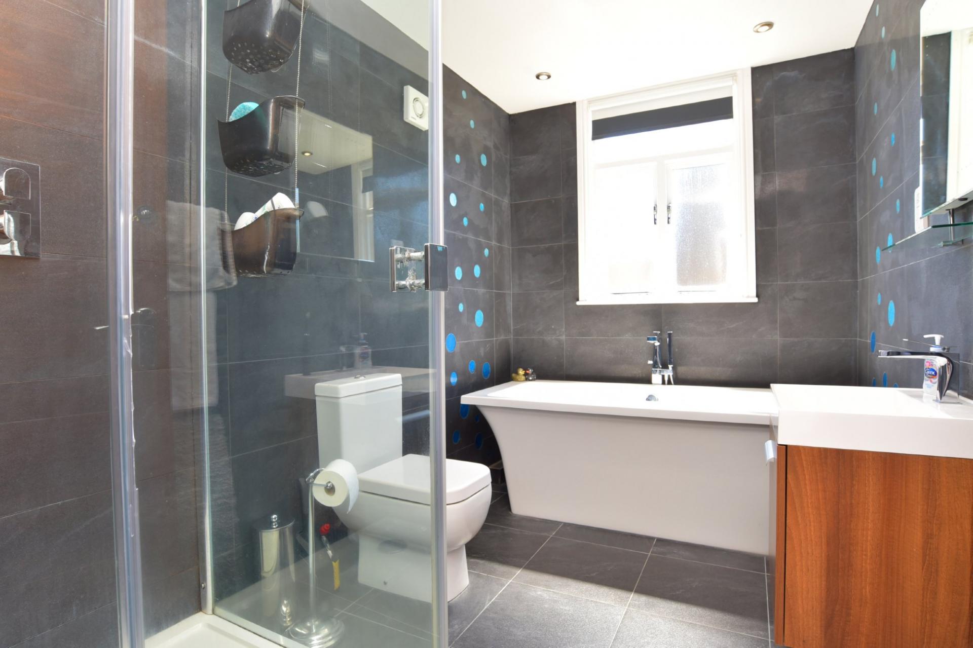 Modern white suite comprising low-flush WC, washbasin, shower and free-standing bath. Tiling to walls and tiled floor with under-floor heating, heated towel rail and window to side.