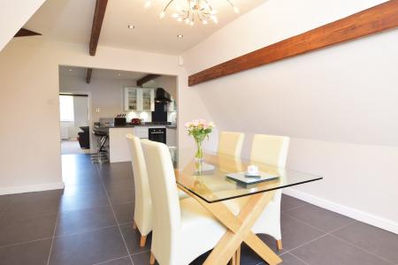 A stunning open-plan dining kitchen with a modern range of wall and base units, work surfaces and breakfast bar. Integrated electric double oven, gas hob with extractor hood above. Integrated appliances include dishwasher and washing machine. Space for fridge / freezer. Two central heating radiators, tiled floor and spacious dining area. Windows to front and side.