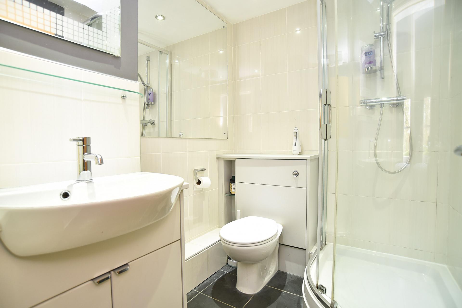 Shower enclosure, low flush wc and vanity unit with inset wash basin.