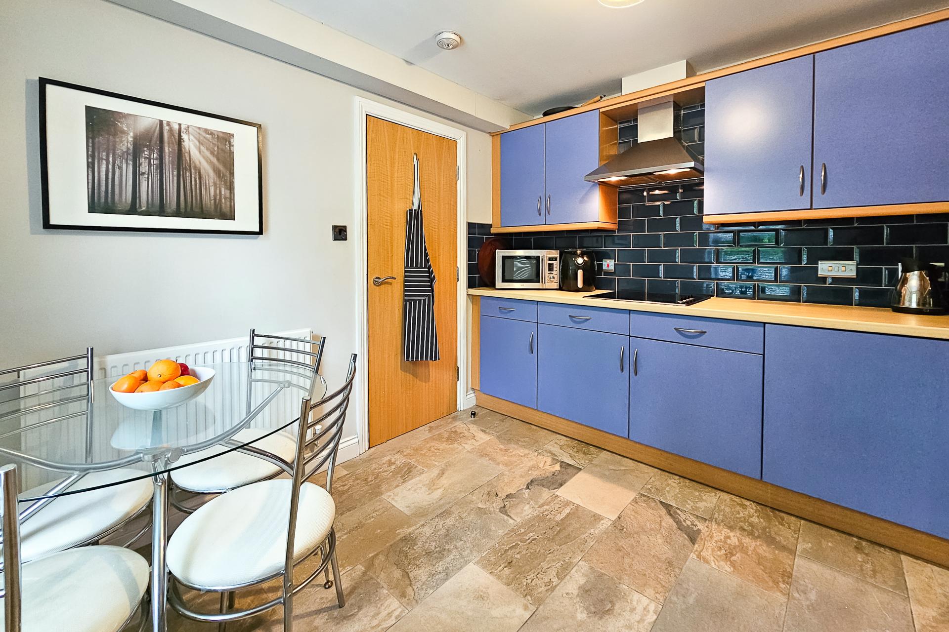 With a range of wall and base units with induction hob and electric oven and integrated fridge / freezer and integrated dishwasher. Windows to side.