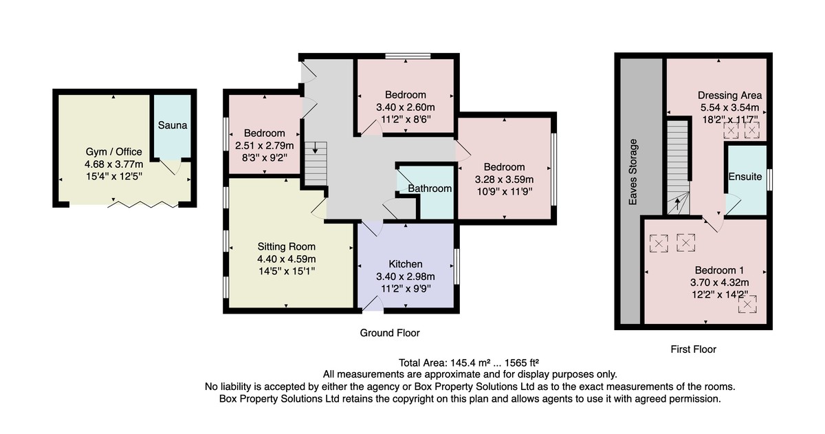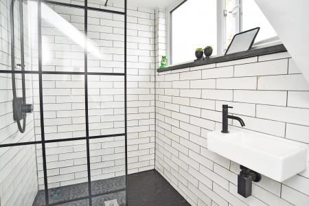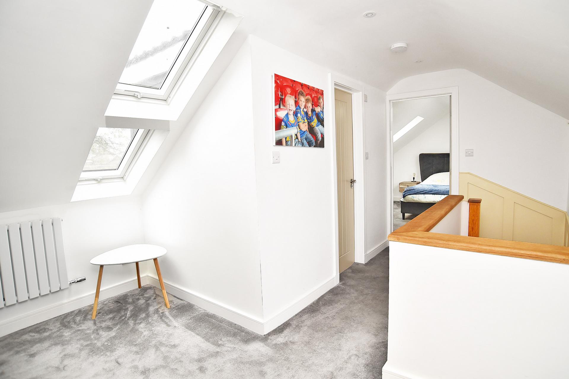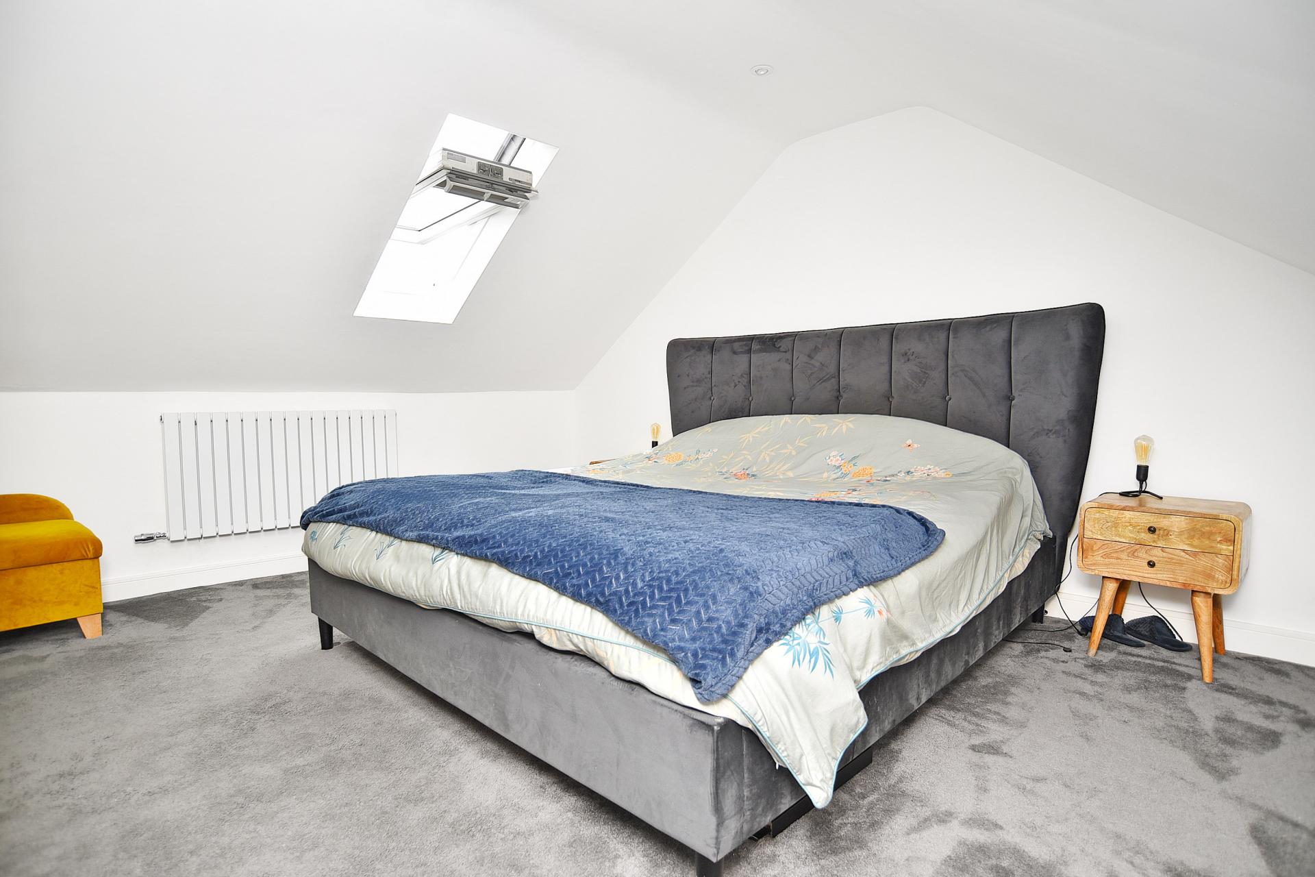 To the first floor, the superb master bedroom suite features a dressing area, an en-suite shower room, and ample eaves storage, creating a private and comfortable retreat.