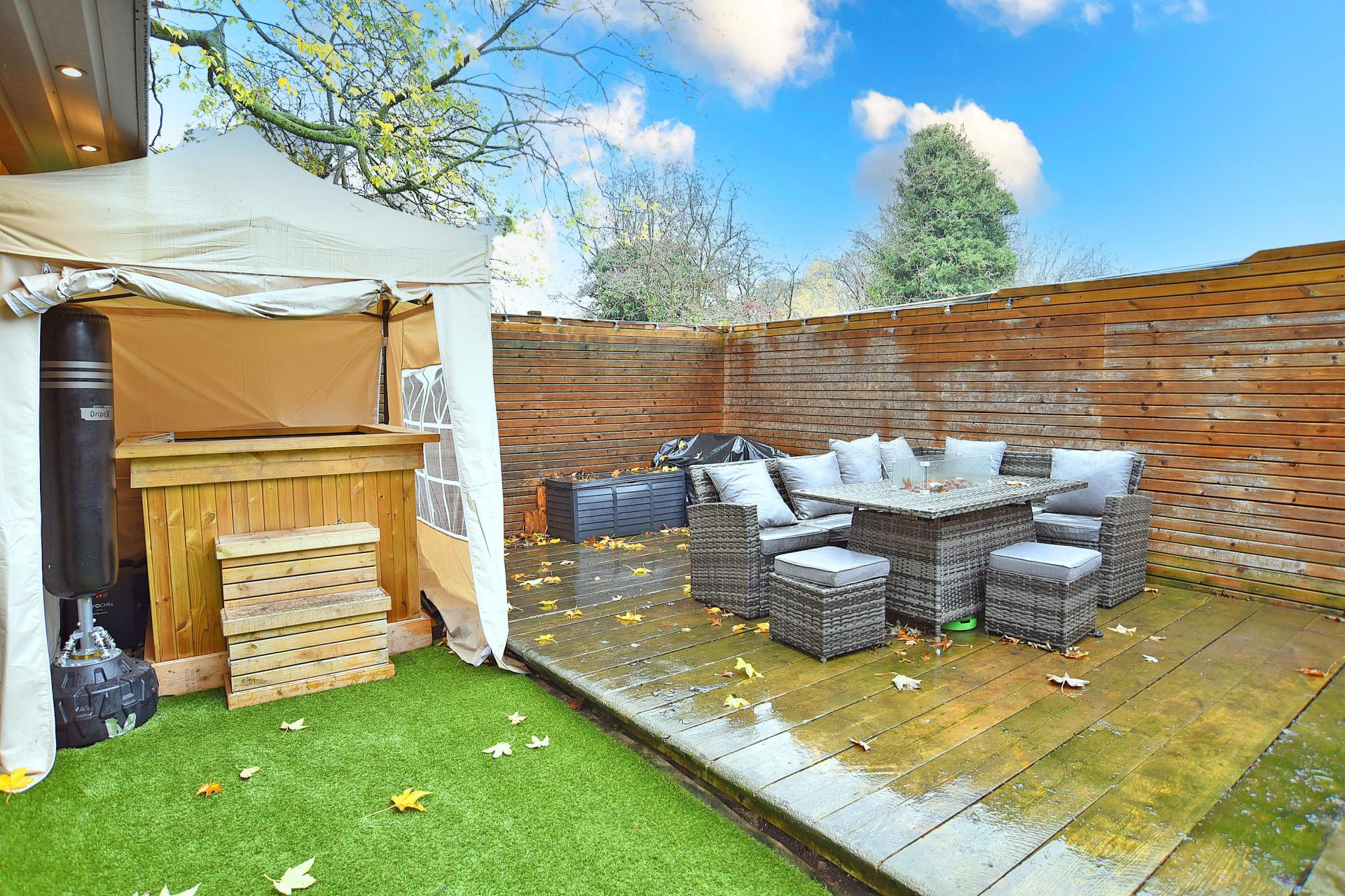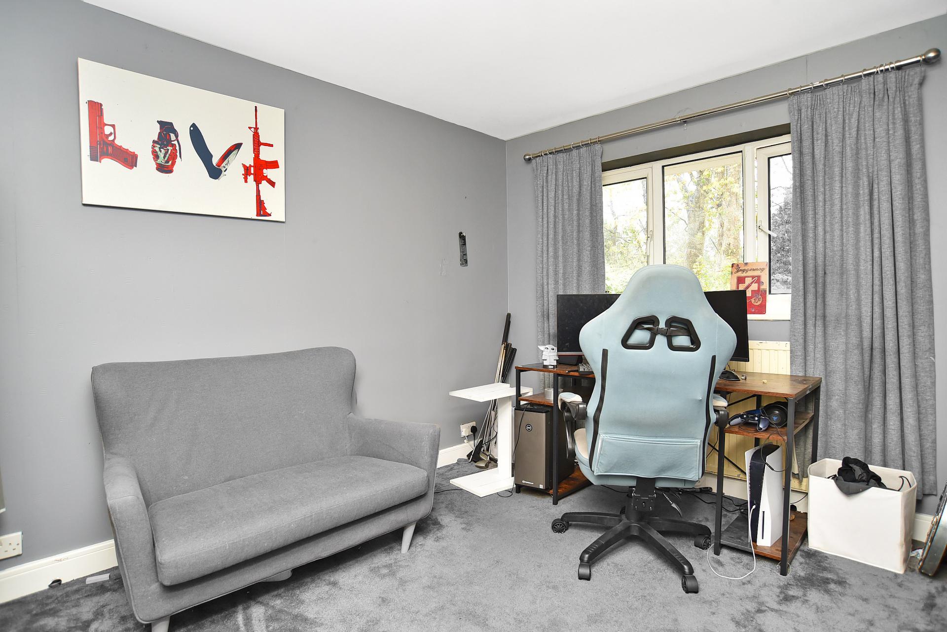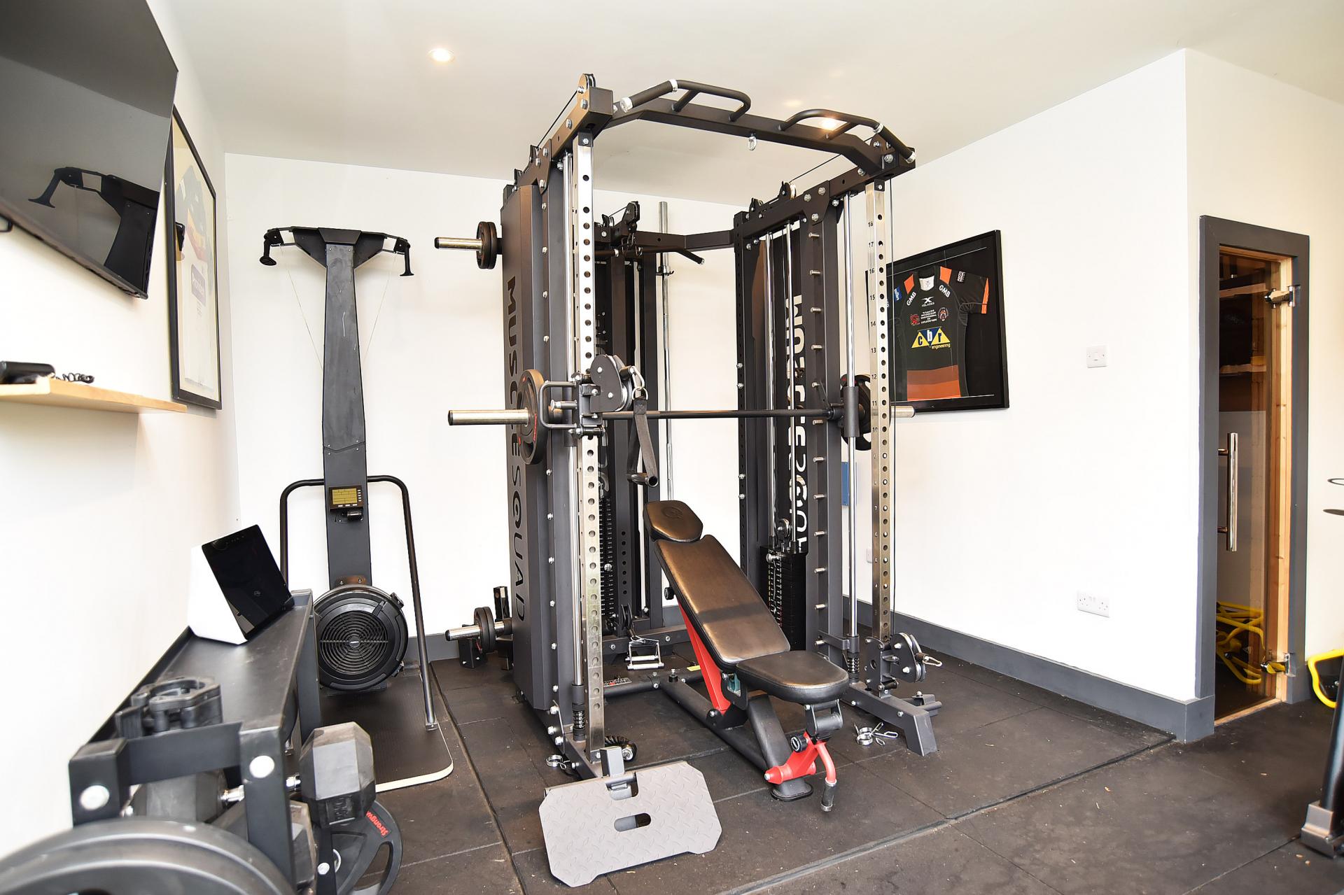 OUTSIDE Outside, a driveway provides off-street parking and leads to a garage. The front garden is laid to a shaped lawn with mature hedging, while the rear garden enjoys a raised paved seating area, decked area, and artificial lawn. A large garden room or gym with sauna and bi-fold doors provides additional versatile accommodation, ideal for use as a home office, studio, or leisure space.