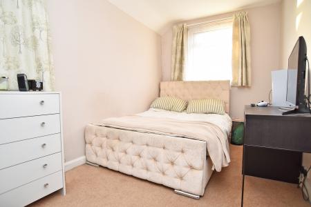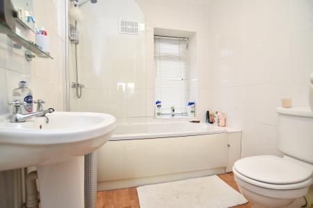 To the first floor are three well-proportioned double bedrooms and a house bathroom fitted with a white suite comprising bath with Mira shower over, pedestal wash hand basin and low-level WC. A frosted front window and shelved linen cupboard complete the space.