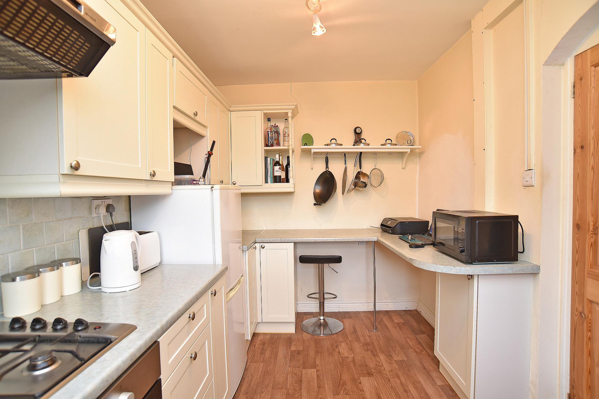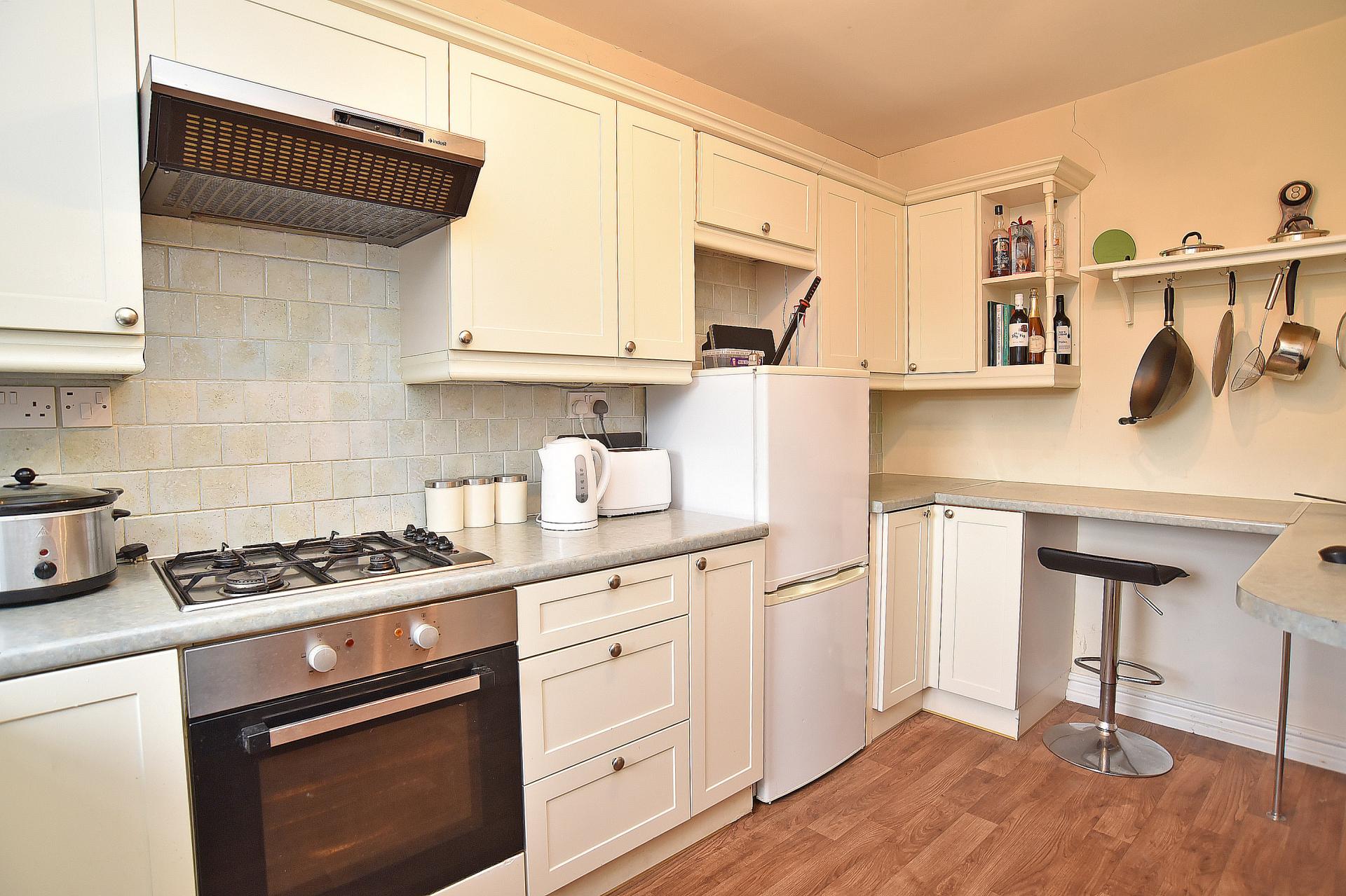 The modern fitted kitchen offers Shaker-style units with complementary work surfaces and tiled splashbacks. Integrated appliances include an electric oven, gas hob with extractor hood, and plumbing for a washing machine. A rear window provides natural light and ventilation.