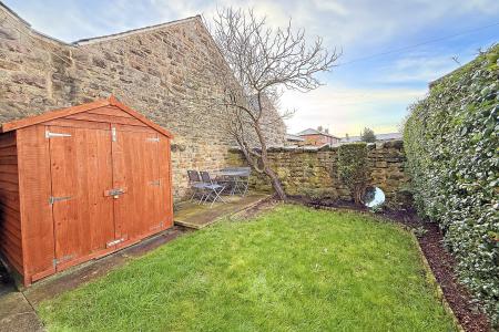OUTSIDE To the rear of the property is a lawned garden with garden shed. A pedestrian gate to the side gives access across the neighbouring property around to the front on Skipton Road.