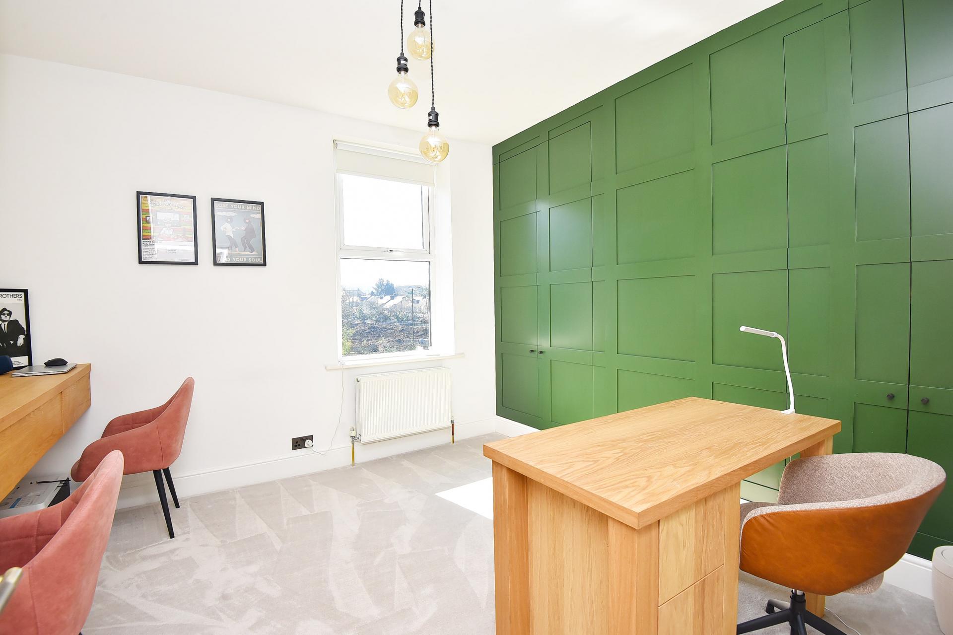 A double bedroom with fitted cupboards and floating desk. Panelled storage wardrobe.