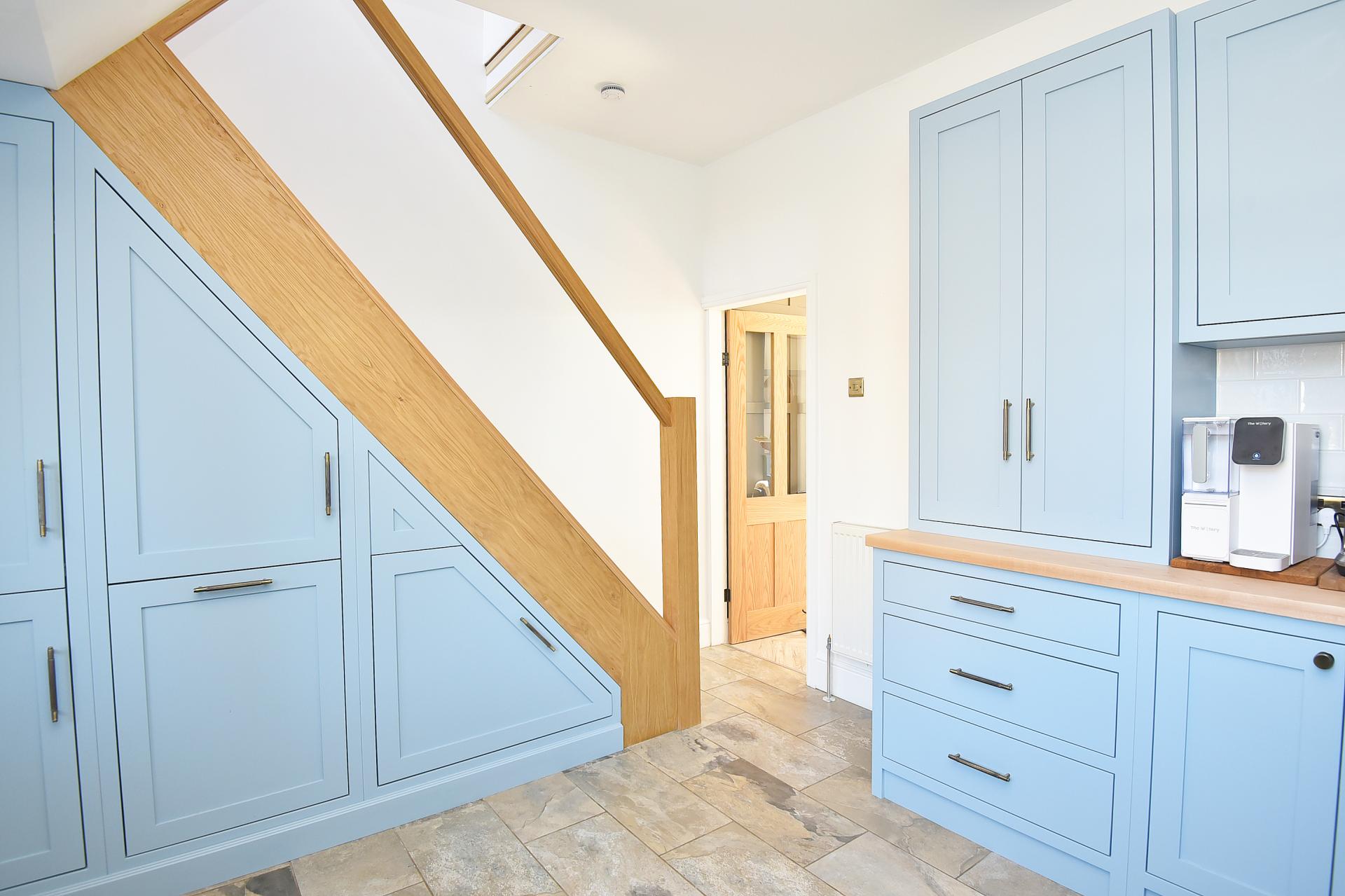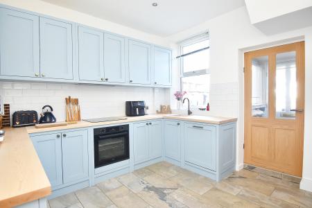 A modern fitted kitchen with a range of stylish wall and base units with maple worktops. Integrated induction hob, oven, fridge / freezer and dishwasher.