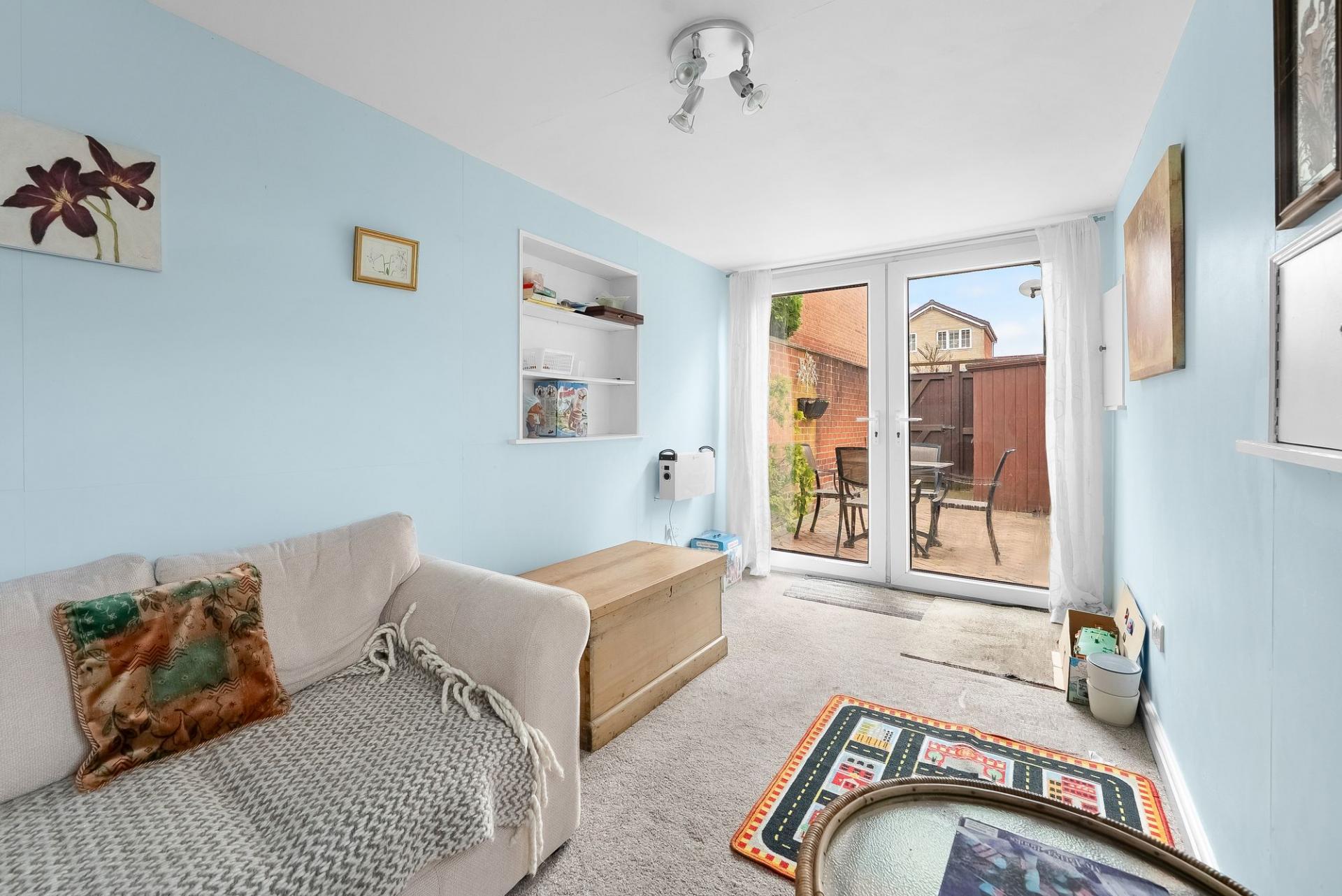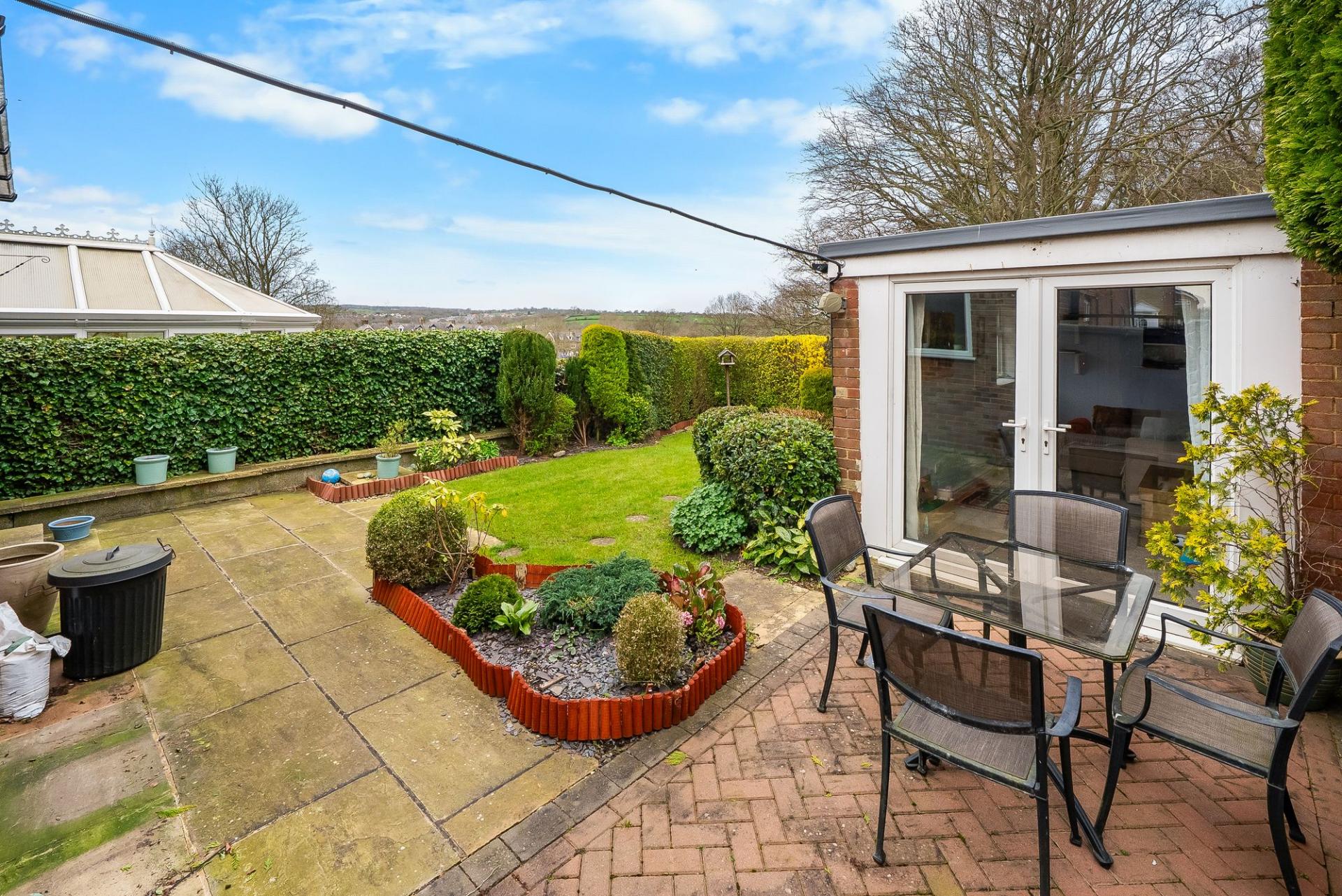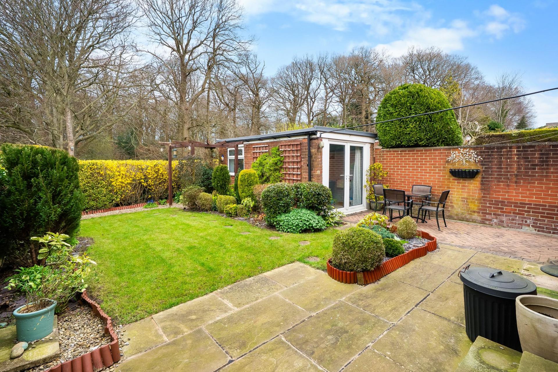 To the rear is an attractive lawned garden with well stocked borders and a paved sitting area, enjoying an open aspect. A particular feature is the converted garage, now forming a fully insulated garden room with glazed doors, power, light and electric heating, ideal for use as a home office. There is also a useful timber shed, store and wood store.