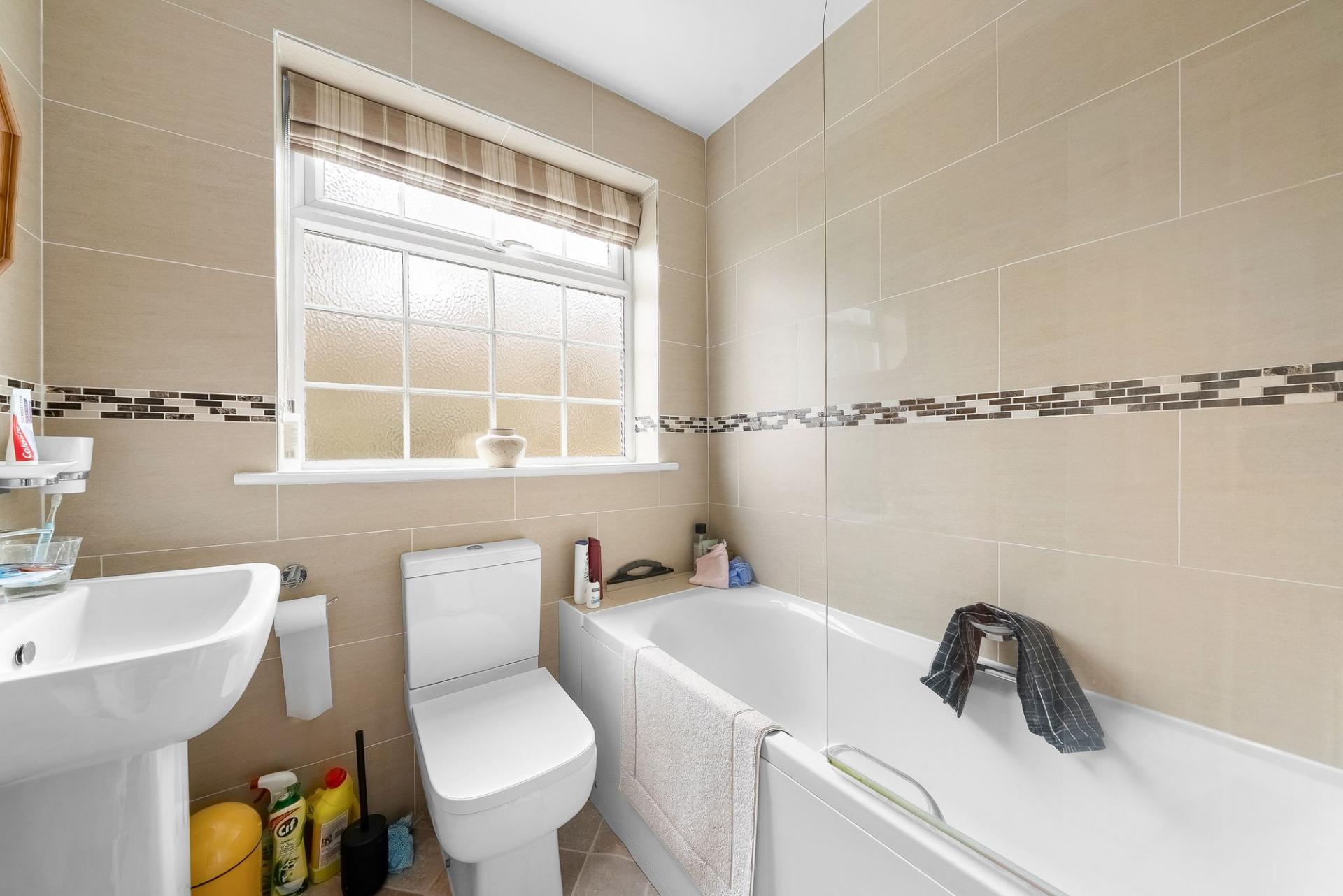 The accommodation is served by a modern house bathroom fitted with a white suite comprising low-level WC, washbasin and bath with shower above. The bathroom also has a rear window together with fully tiled walls and floor.