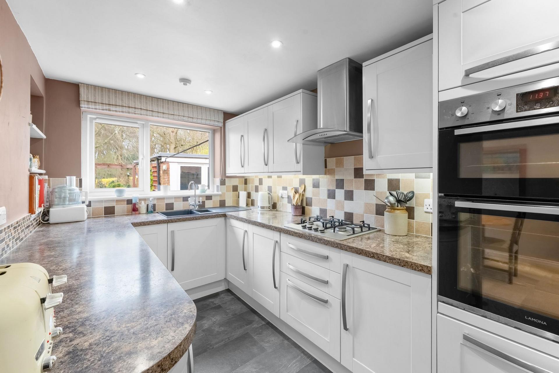The separate kitchen is fitted with a range of stylish wall and base units together with a gas hob with extractor hood above, integrated electric oven and grill, and space for a fridge freezer, washing machine and tumble dryer. There is a window overlooking the rear garden.