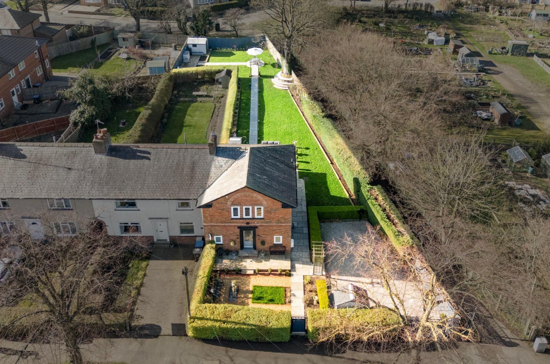 The rear garden is undoubtedly one of the home’s most impressive features, extending to an exceptional length and having been carefully landscaped to create a series of distinct outdoor spaces. Immediately behind the house is a paved terrace ideal for outdoor dining and entertaining, beyond which a central pathway leads through the lawn to a charming circular seating terrace.