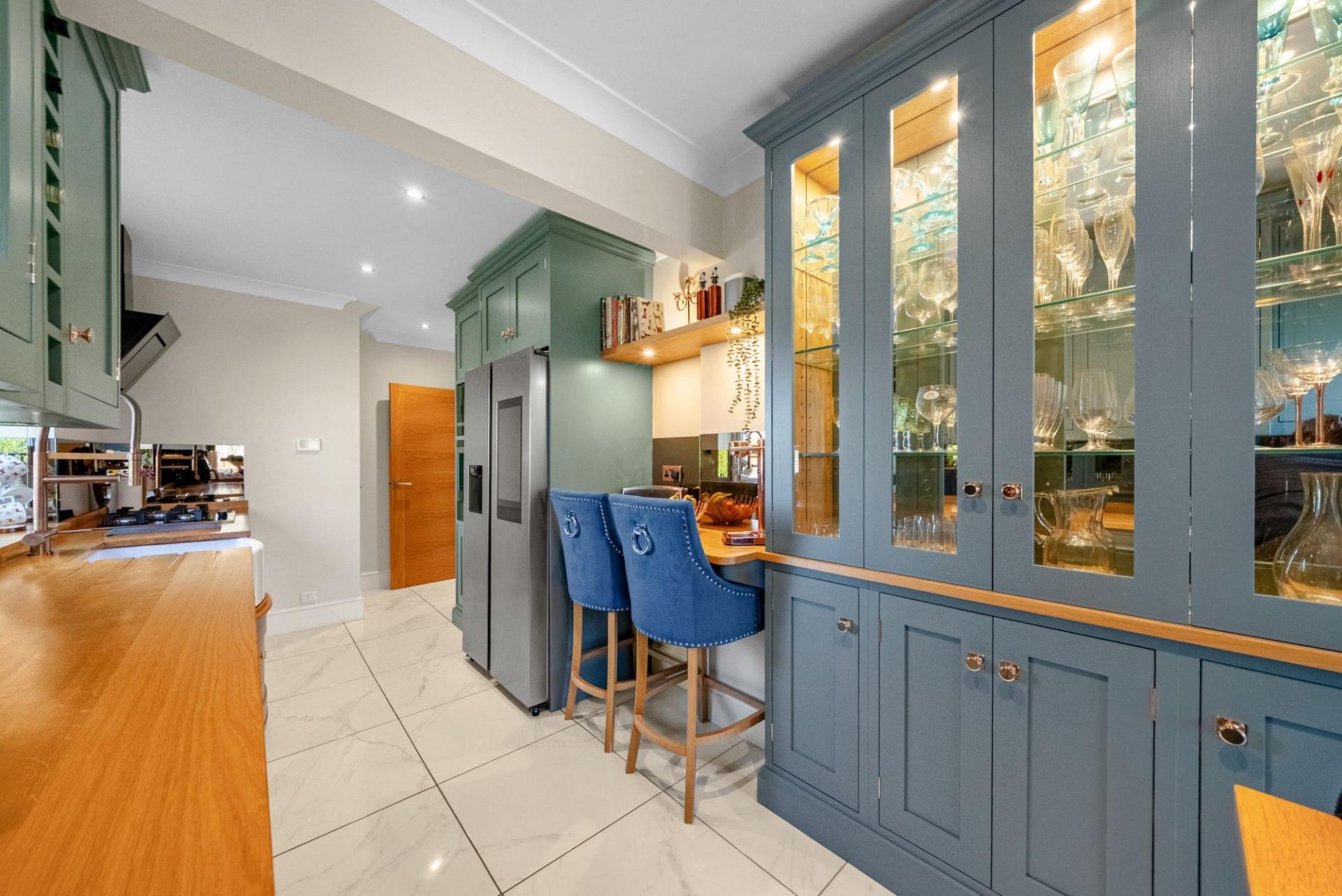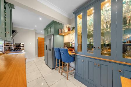 The property also benefits from a superb bespoke breakfast kitchen, thoughtfully designed and fitted with an extensive range of shaker-style cabinetry complemented by timber work surfaces and glazed display units. A breakfast bar provides a perfect space for informal dining and everyday living.