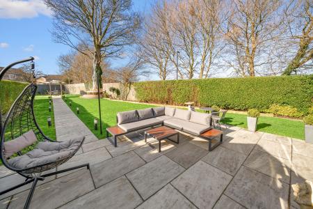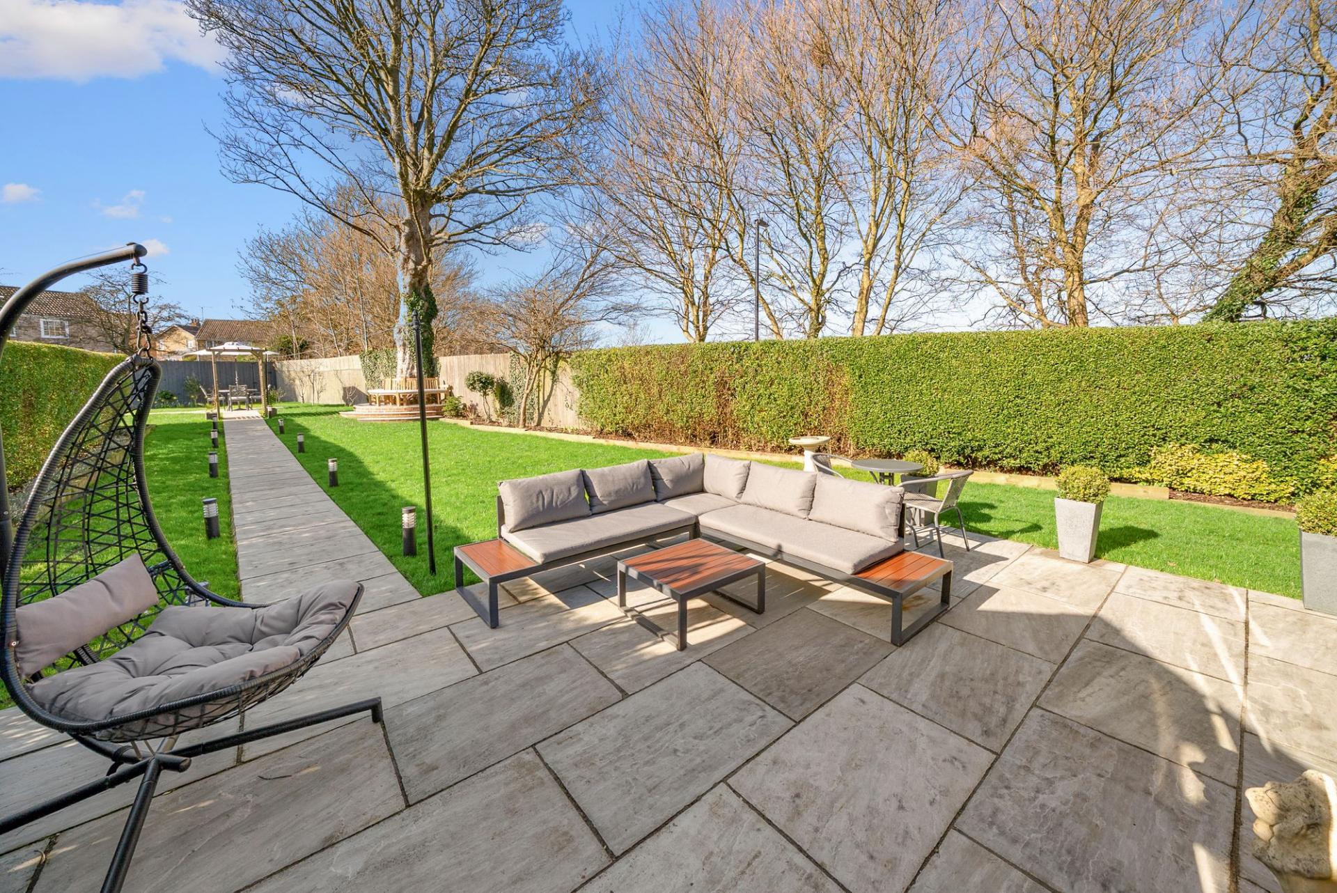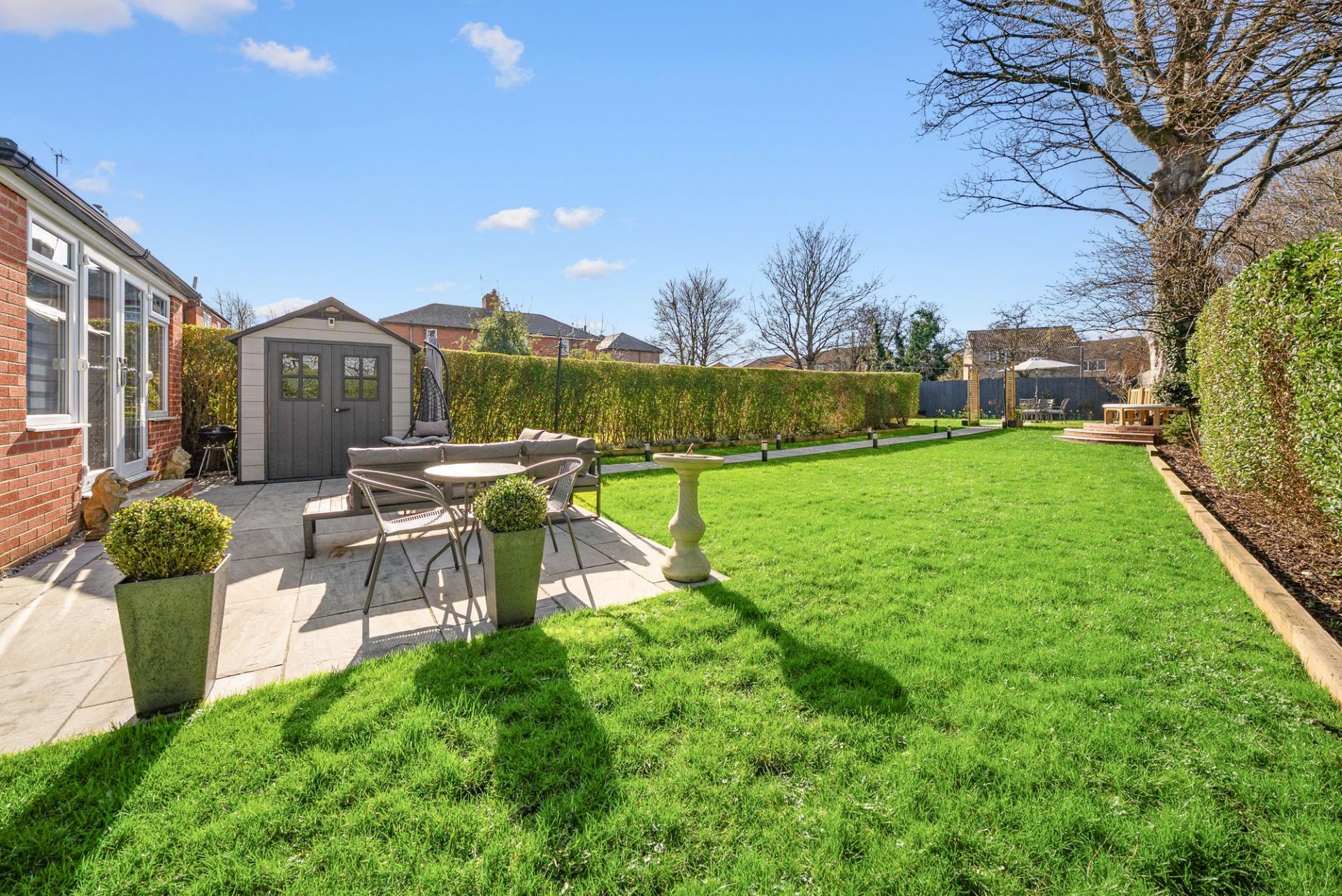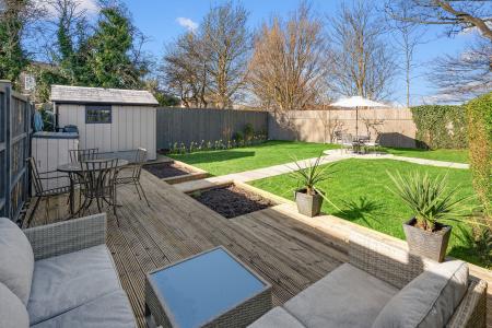 Additional seating areas, established planting, mature hedging and a garden shed further enhance this superb outdoor environment.