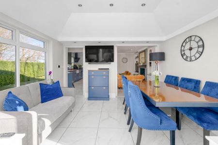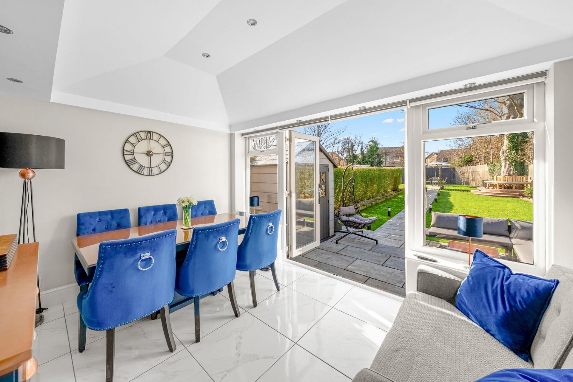 Beyond this lies a superb dining and reception area with vaulted ceiling and glazed doors opening directly onto the garden, creating a wonderfully bright and sociable living space ideal for entertaining and family life. The space further benefits from electric blinds, providing both convenience and privacy while maintaining the clean contemporary aesthetic of the room.