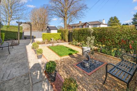 The front garden has been thoughtfully arranged with gravelled areas, planting borders and a paved terrace leading to the entrance, together with a private driveway providing off-street parking. The frontage is enclosed by neatly maintained hedging and lockable exterior gates, providing both privacy and an added level of security.