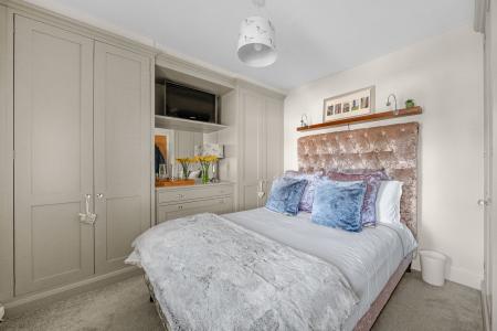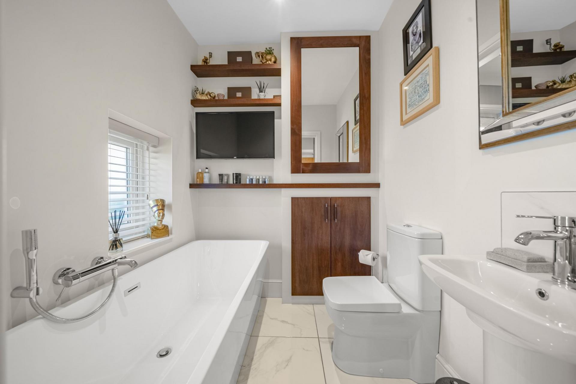 Completing the ground floor is a luxurious bathroom, fitted with a contemporary suite including a freestanding bath together with the distinctive addition of a built-in television, creating an indulgent and relaxing space.