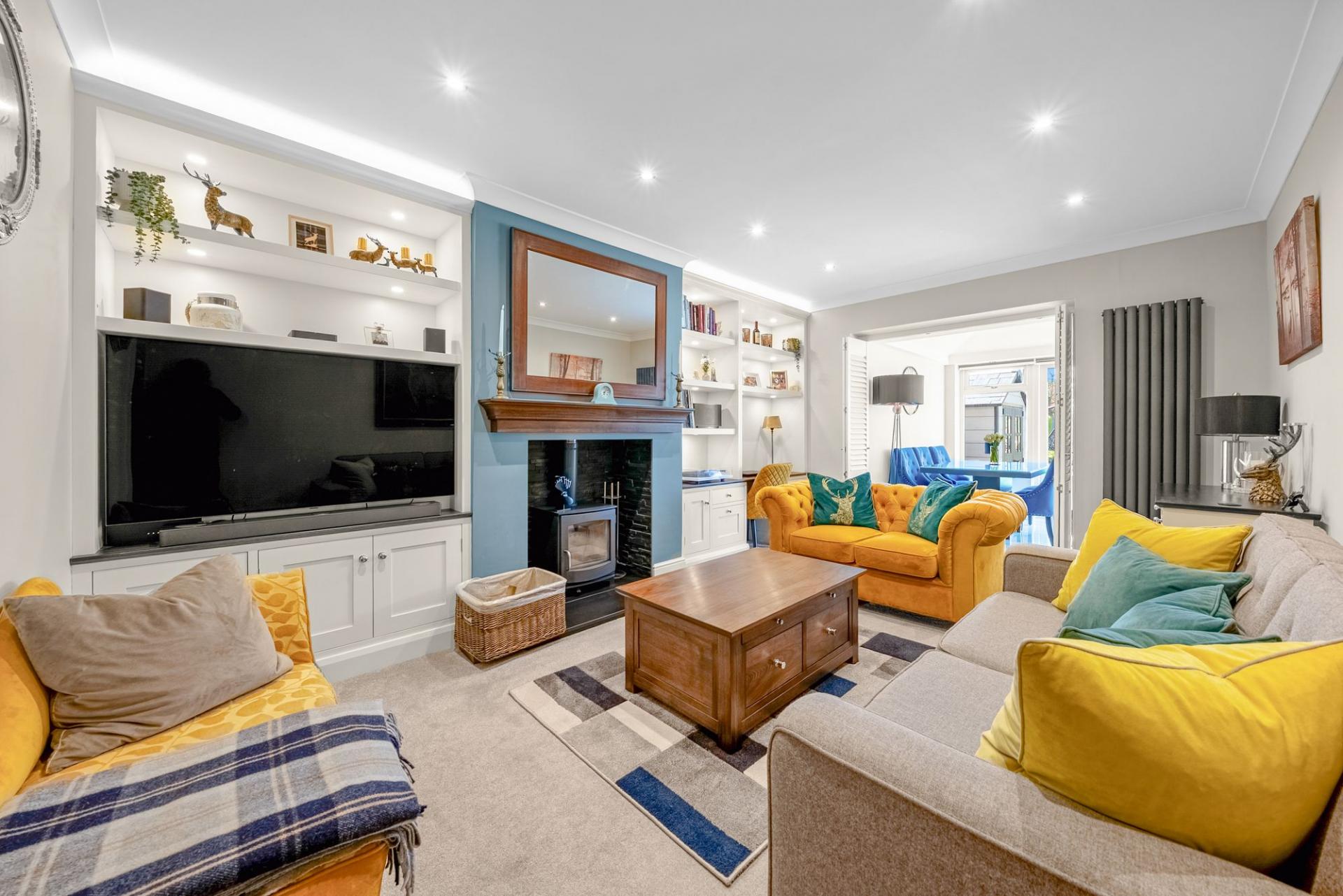 The lounge is a beautifully appointed reception room featuring bespoke fitted cabinetry and shelving together with a stylish fireplace incorporating a wood-burning stove, creating an attractive focal point and a warm, inviting atmosphere.