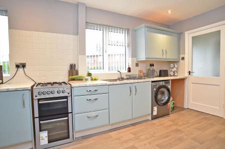 To the rear of the property is a modern dining kitchen fitted with a range of contemporary wall and base units complemented by work surfaces and tiled splashbacks. The kitchen includes an integrated oven with gas hob, stainless steel sink unit positioned beneath a window, and space for additional appliances. There is ample room for everyday dining, and a door provides access to the rear garden. Off the kitchen is a useful ground-floor cloakroom fitted with WC and washbasin.