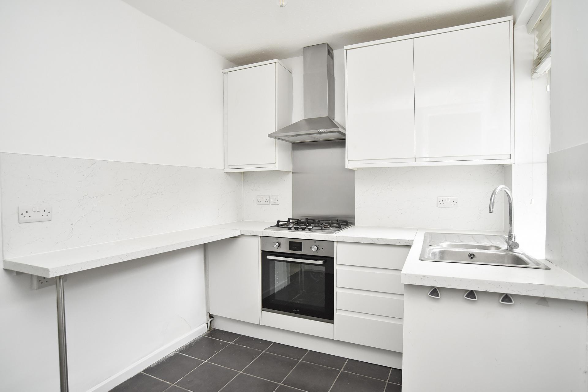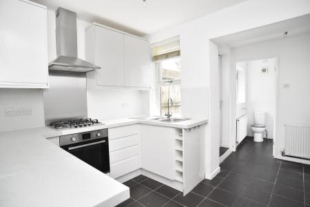 Fitted with a range of wall and base units with inset sink unit. gas hob with extractor hood above and integrated electric oven. Window to rear and central heating radiator. Door leads to garden.