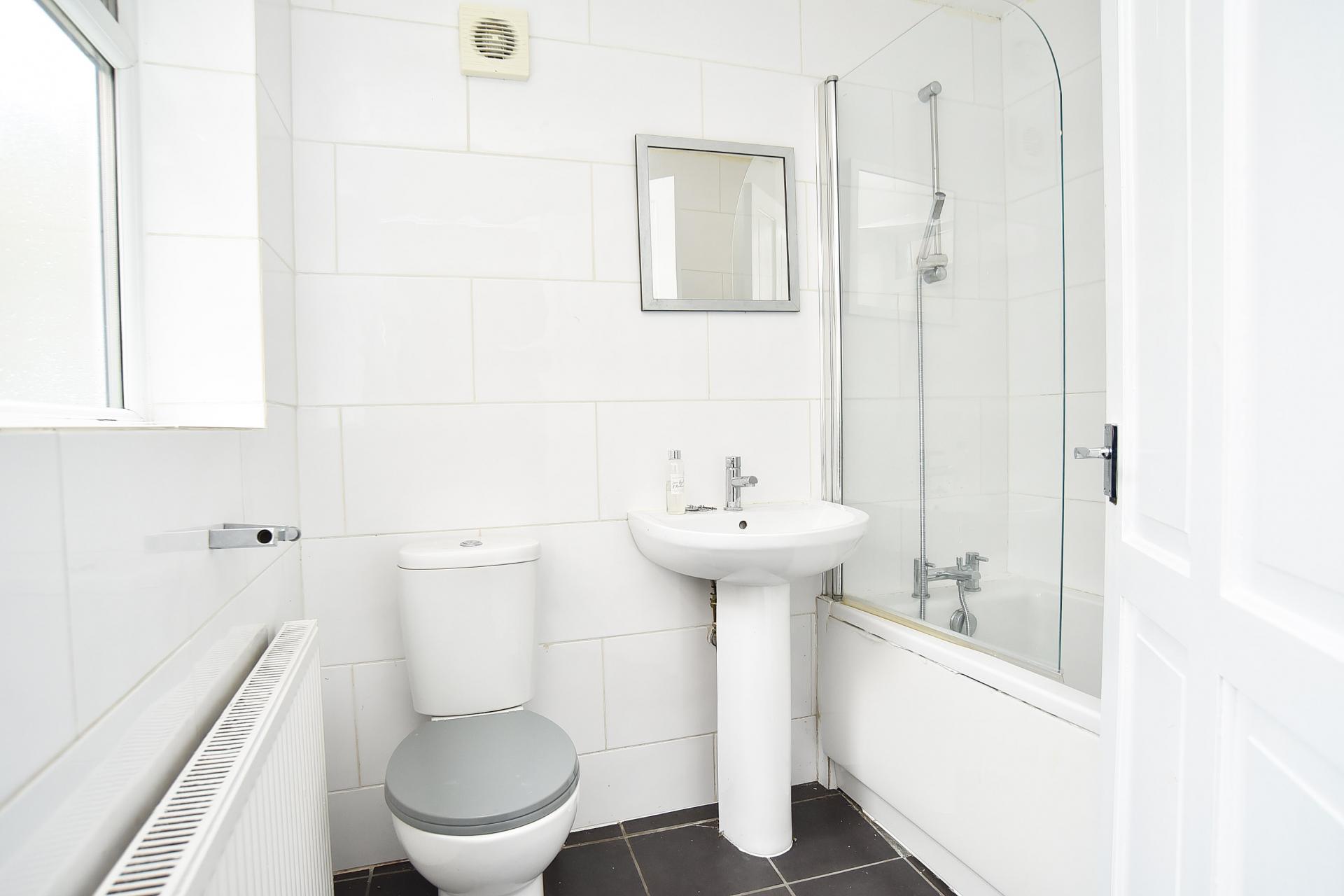 Fitted with a white suite comprising low flush WC, wash basin and bath with shower. Window to side and central heating radiator.