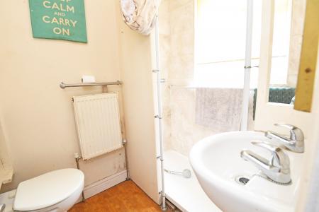 Double glazed window to the side, fitted cupboards/shelves, step in shower, W/C, sink and a radiator.