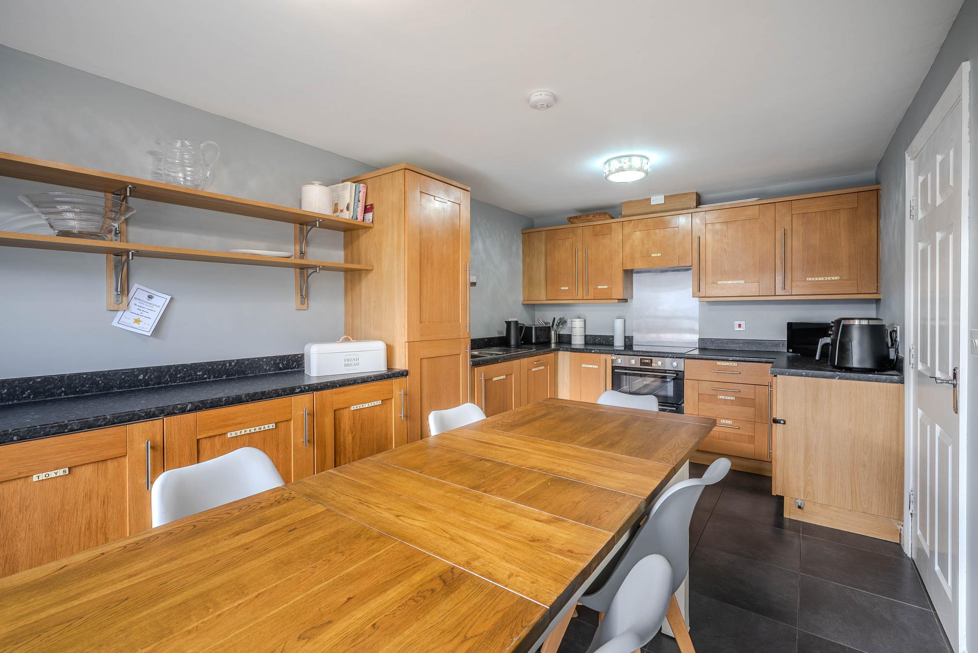 Fitted with a range of modern wall and base units and integrated appliances. Space for dining table. Glazed doors lead out to the garden.