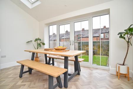 The dining area is seamlessly open-plan and enjoys excellent natural light via two skylights and full-width French doors, offering direct access to the rear garden and creating a bright, airy environment ideal for entertaining and everyday dining. Stylish herringbone flooring flows throughout the space, enhancing the contemporary yet timeless finish.