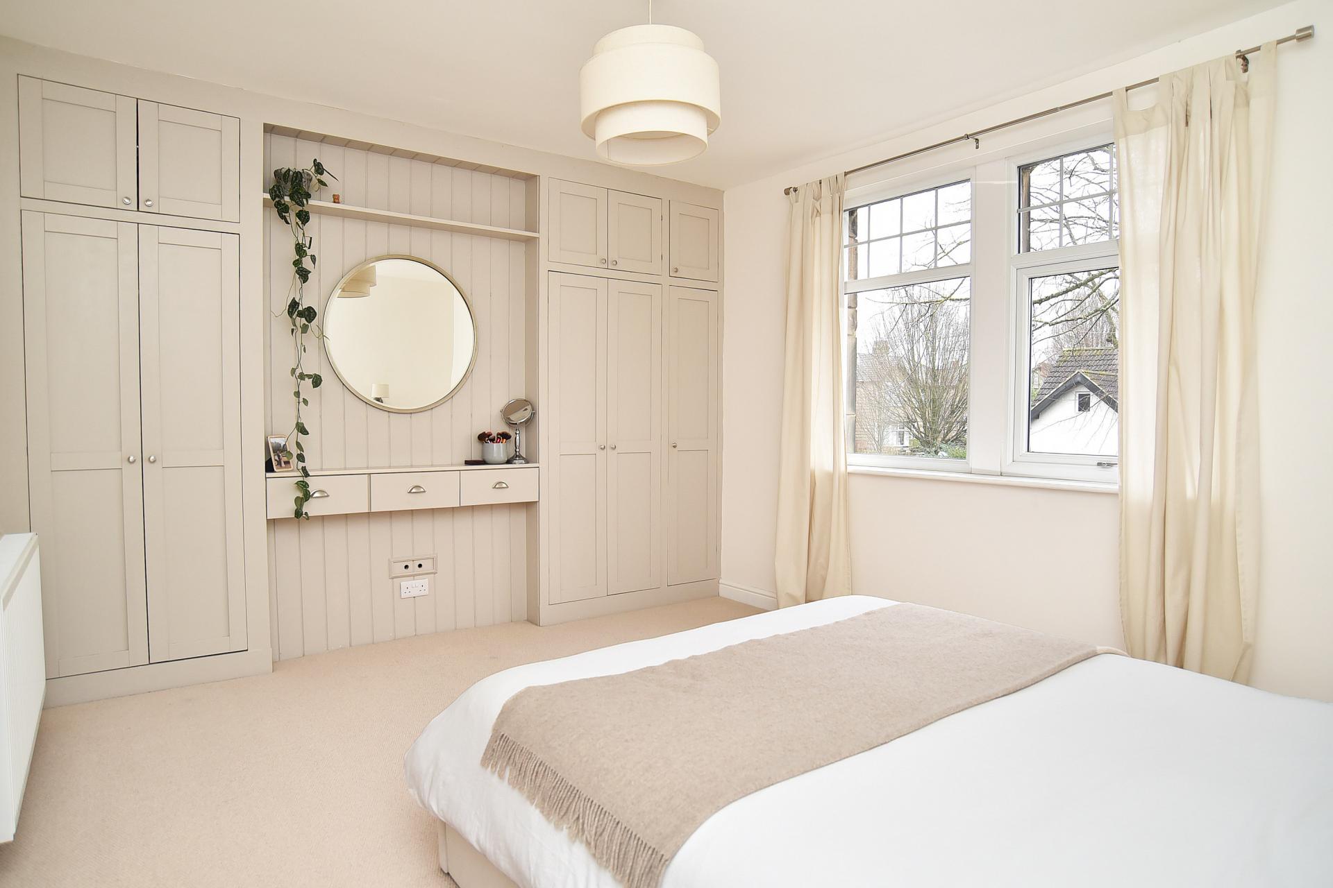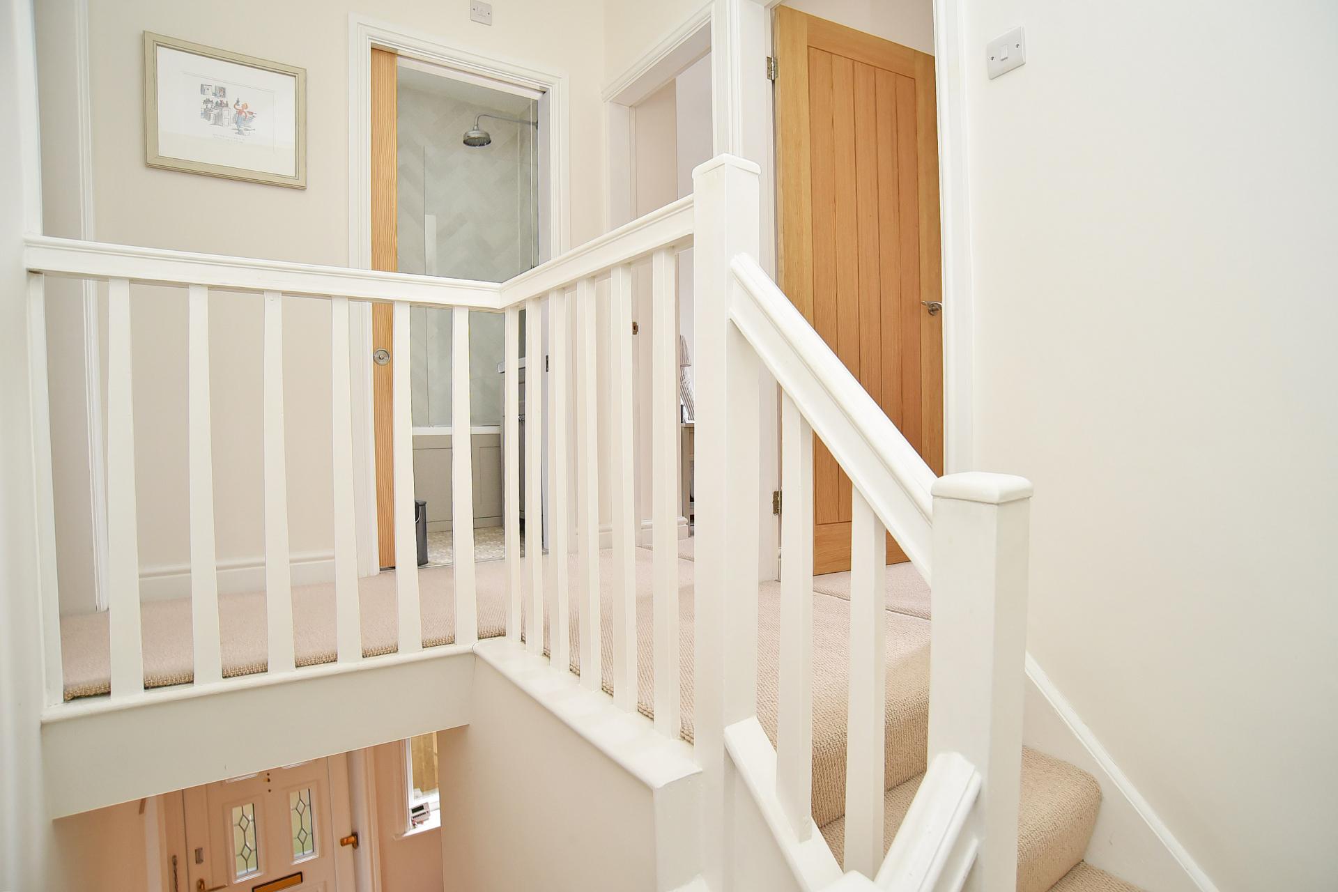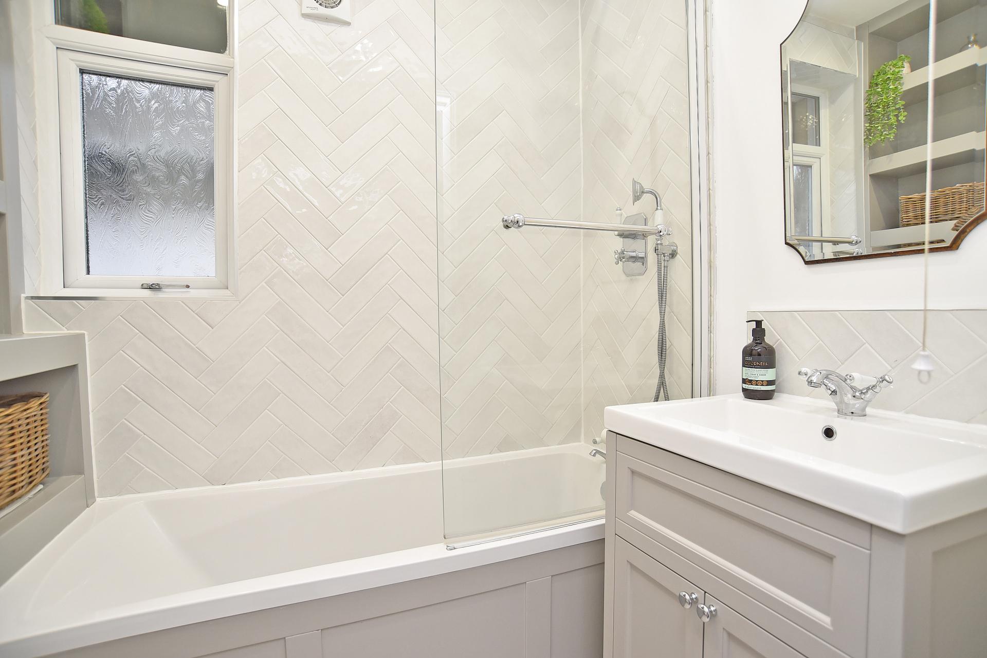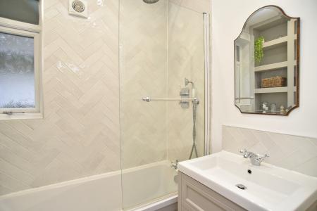 To the first floor are three well-proportioned bedrooms, including a spacious principal bedroom benefitting from bespoke fitted wardrobes and dressing area. The accommodation is served by a stylish modern family bathroom, finished to a high standard with contemporary fittings, full-height tiling, panelled bath with glass shower screen and built-in storage.
