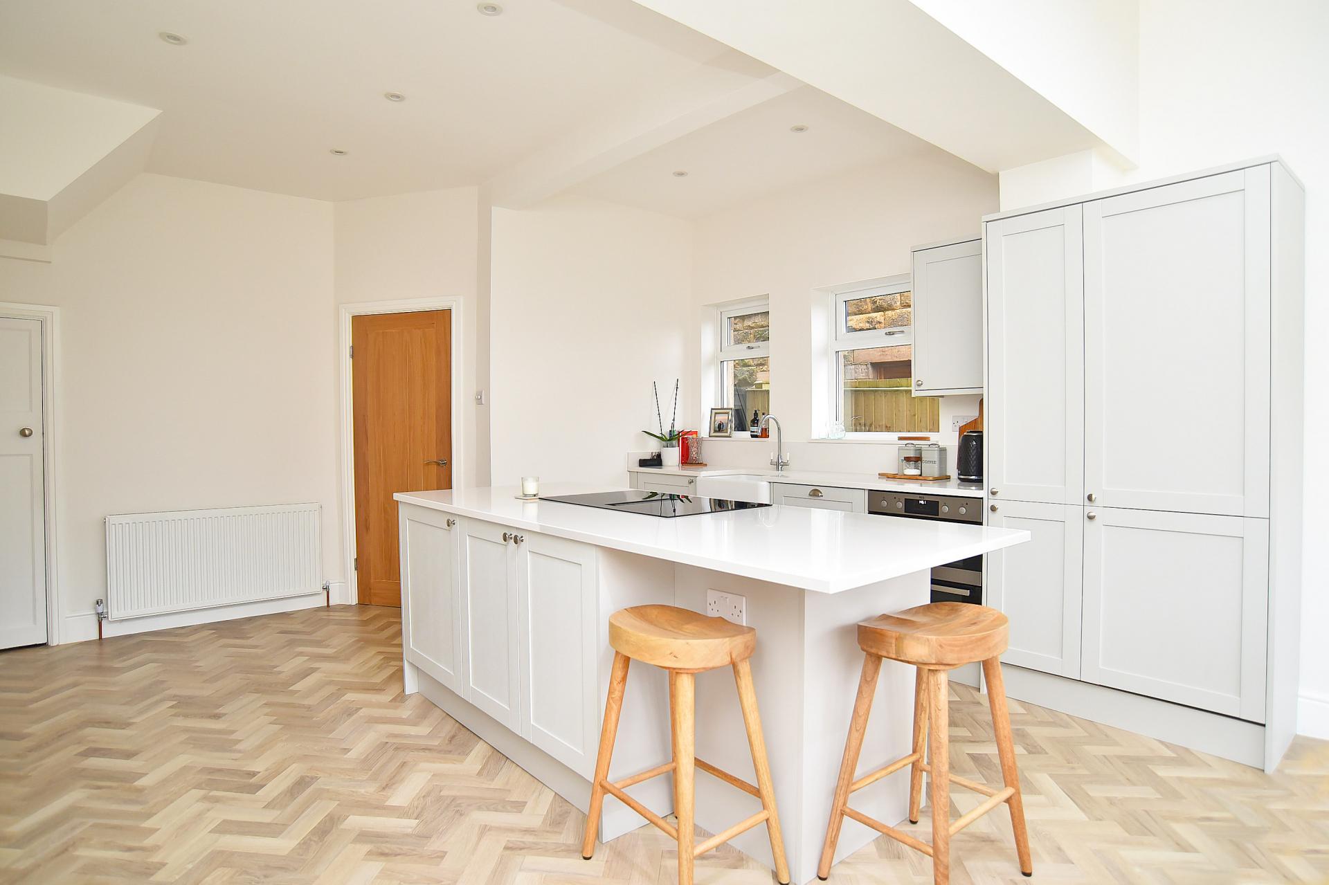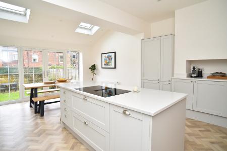 To the rear, the property opens into a stunning extended open-plan dining kitchen, which forms the true heart of the home and has been thoughtfully designed for modern family living and entertaining. The bespoke fitted kitchen features quartz worktops, a Neff downdraft induction hob with integrated extraction, and a ceramic Belfast sink. Integrated appliances include a double oven, dishwasher, tumble dryer, washing machine and integrated fridge freezer, seamlessly incorporated into the cabinetry to create a sleek and cohesive finish. A large central island provides additional storage and generous preparation space while creating a natural social hub.