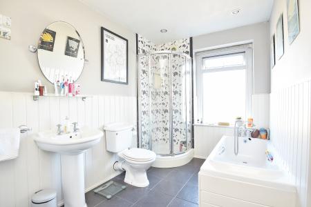 Three-piece suite comprising low-flush WC, washbasin and separate shower cubicle. Window to rear, heated towel rail and storage units.
