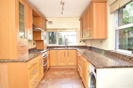 Fitted with a range of wall and base units with granite worktops. Appliances include a gas hob, integrated double oven, integrated dishwasher, and there is space and plumbing for additional appliances.