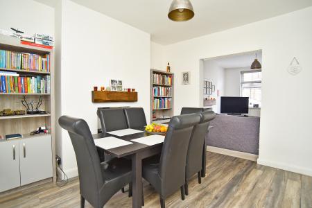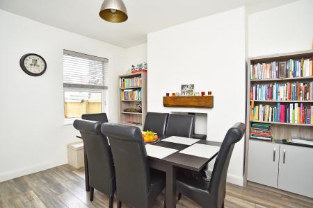 Internally, the accommodation briefly comprises an entrance hall leading into a bright bay-fronted sitting room featuring a character fireplace with inset stove, creating a warm and cosy focal point. The sitting room opens through to the dining area, providing an excellent open-plan living and entertaining space. To the rear is a contemporary fitted kitchen finished to a high standard, featuring sleek wall and base units, wood-effect worktops, tiled splashbacks, integrated appliances, recessed ceiling lighting and ample worktop space. A side access door provides convenient external access.