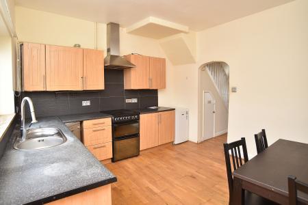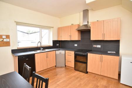 Range of wall and base units, working services having slate splashbacks and inset double-bowl sink. Space for electric cooker extractor fan over. Integral fridge. Space for dining table, uPVC double-glazed window to the rear, central heating radiator.