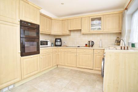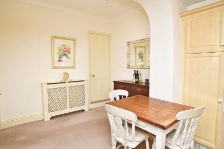 To the rear, the property has been thoughtfully extended to create a bright and sociable open-plan dining kitchen, very much the heart of the home. The kitchen is fitted with a comprehensive range of wall and base units with complementary work surfaces and integrated double ovens. A skylight overhead, together with a window and glazed door, floods the space with natural light and provides access to the courtyard garden. The adjoining dining area sits comfortably beneath an attractive archway, creating a seamless flow between cooking and entertaining spaces.
