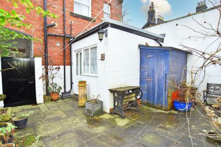 To the rear is a fully enclosed courtyard garden, laid predominantly with stone paving for ease of maintenance and bordered by whitewashed walls, creating a sheltered and private outdoor setting. Mature planting and potted shrubs add colour and interest, while a useful outbuilding provides practical storage. The courtyard offers a charming and tranquil retreat, ideal for outdoor seating and entertaining.