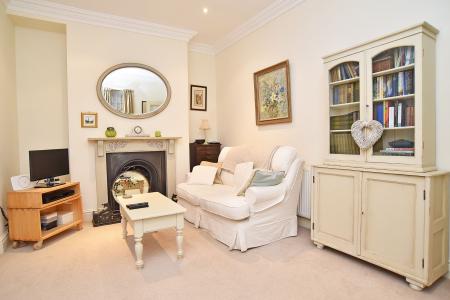 The elegant sitting room is a beautifully proportioned space featuring high ceilings with decorative cornicing and a charming period fireplace forming a central focal point. A large window to the front elevation allows excellent natural light, enhancing both the sense of space and the room’s inherent character.