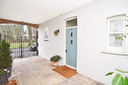 The property is approached via an attractive covered entrance with traditional detailing and wrought iron gates, enhancing both privacy and character.