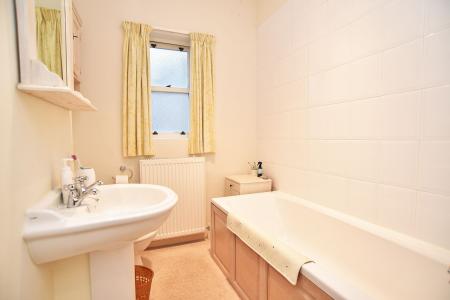 The second bedroom is served by a well-appointed house bathroom fitted with a white suite comprising bath with shower over, pedestal wash basin and WC.