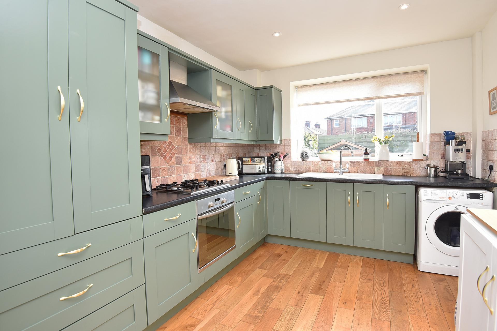 With a range of stylish fitted units with gas hob, integrated oven, dishwasher and space and plumbing for washing machine and other appliances.