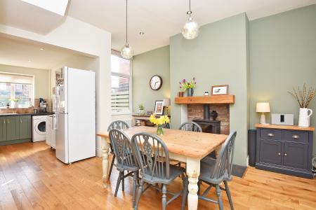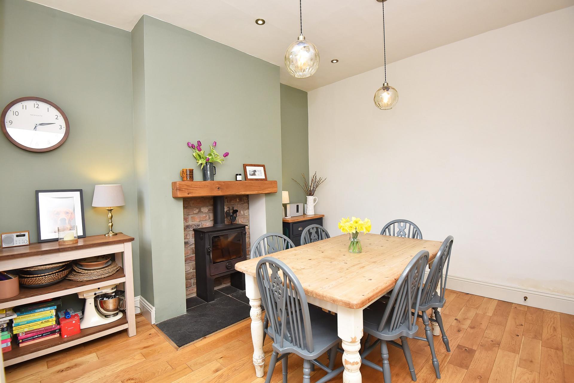 A further reception room with window to rear and fireplace with wood-burning stove. Under- stairs cupboard.