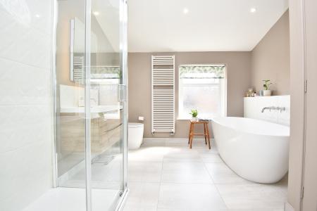 A modern white suite comprising WC, washbasin set within a vanity unit, free-standing bath and shower. Tiled floor. Heated towel rail. Fitted cupboard.