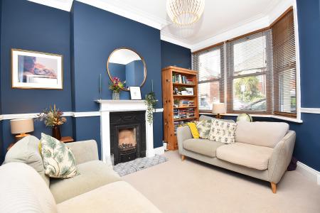 A spacious reception room with bay window two front. Feature fireplace with living-flame gas fire.