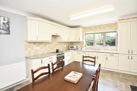 With spacious dining area. The kitchen comprises a range of fitted units with integrated electric hob and double oven and space for appliances.