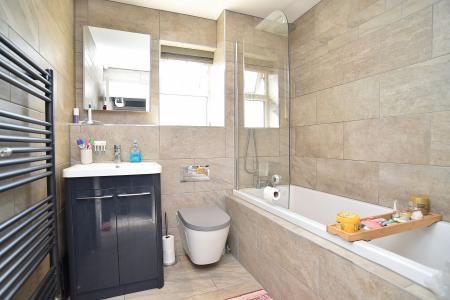 A recently fitted and stylish bathroom with a white suite comprising bath with shower over, low-flush WC, and washbasin set within a vanity unit. Tiled floor and walls.
